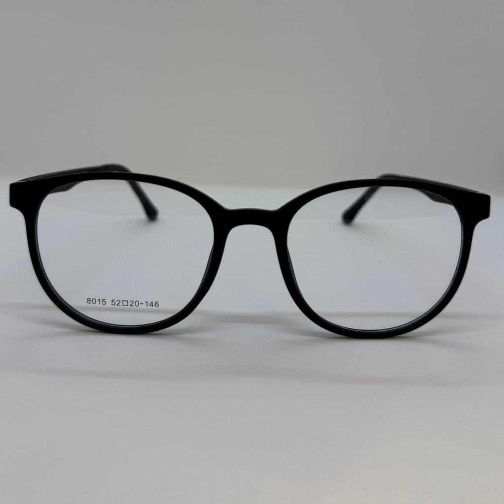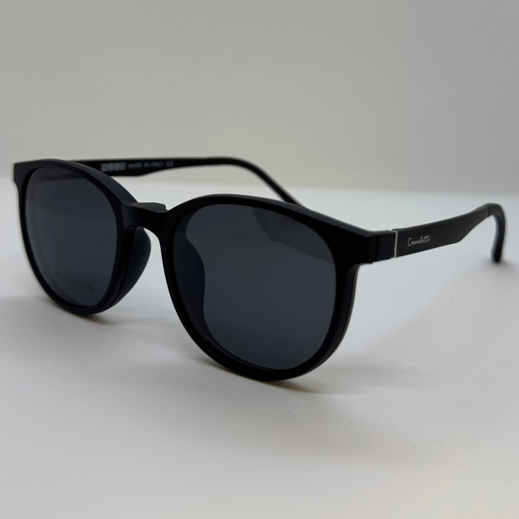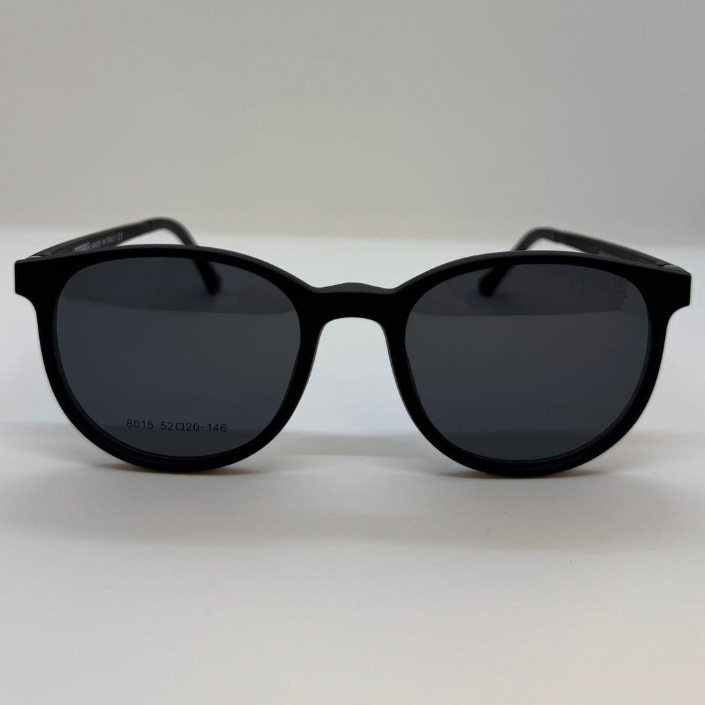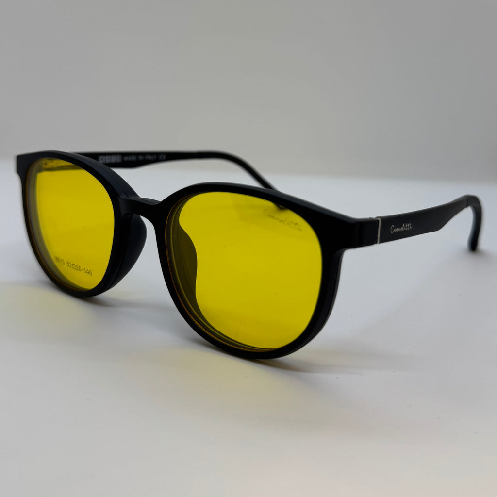 Armação em acetato preto com Clipon solar preto e Clipon lente amarela.