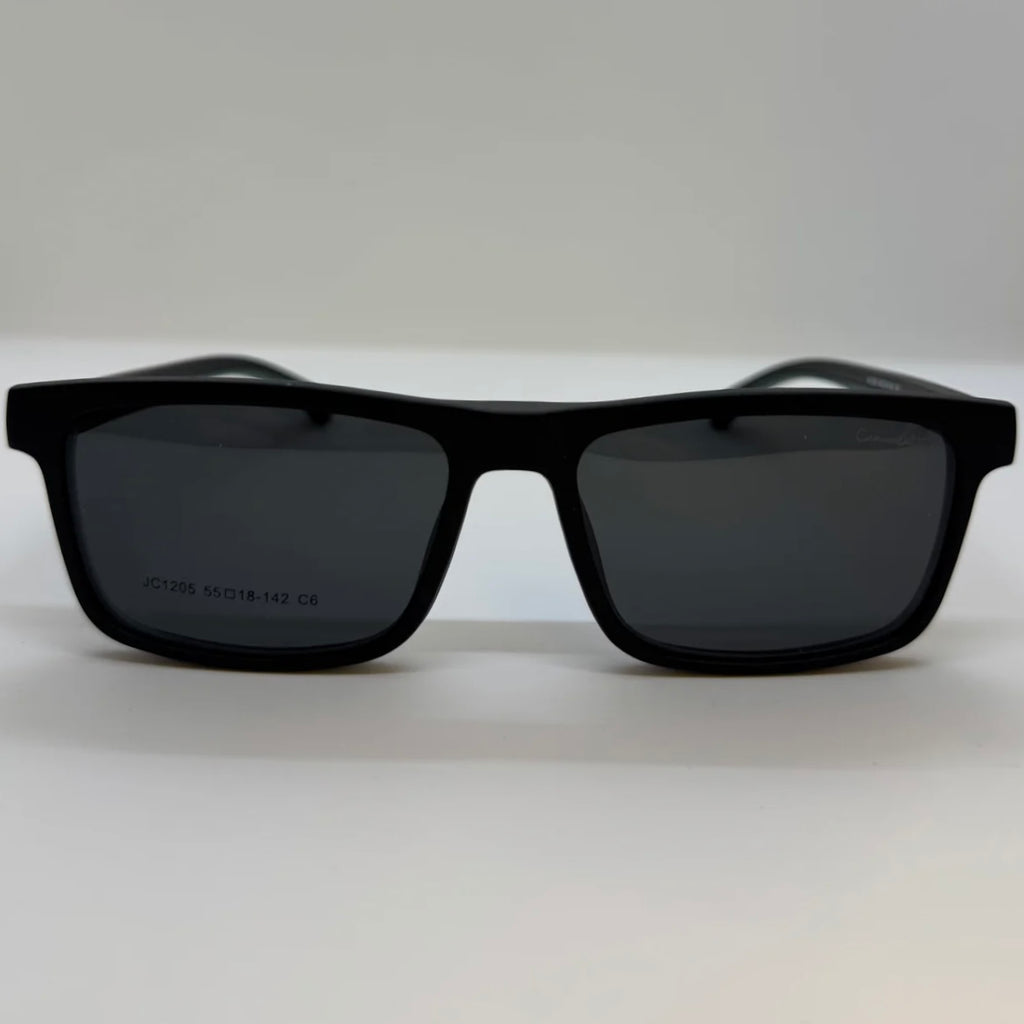 Óculos com armação de grau em acetato preto, hastes com encaixe confortável seguindo a mesma cor preta da parte frontal mas possuindo alguns detalhes minimalistas verde, além de conter clipon em acetato preto.