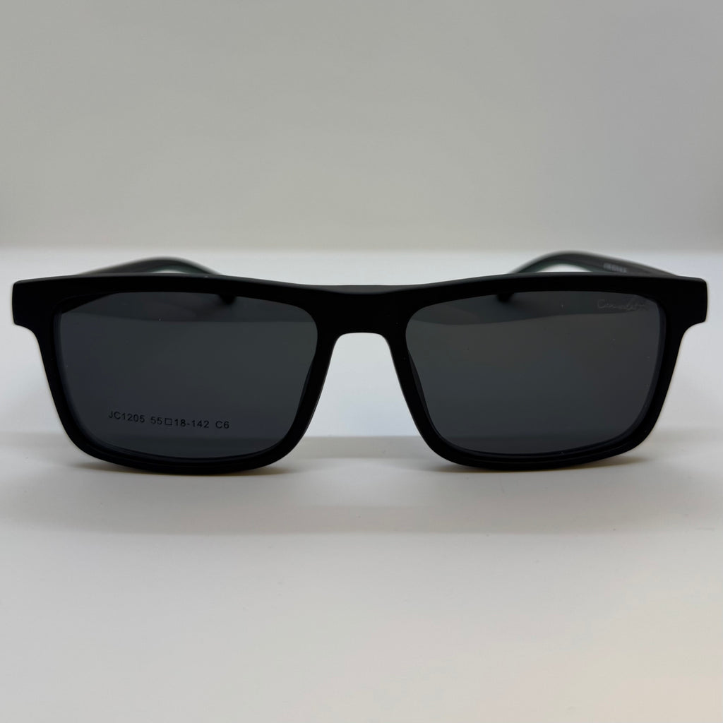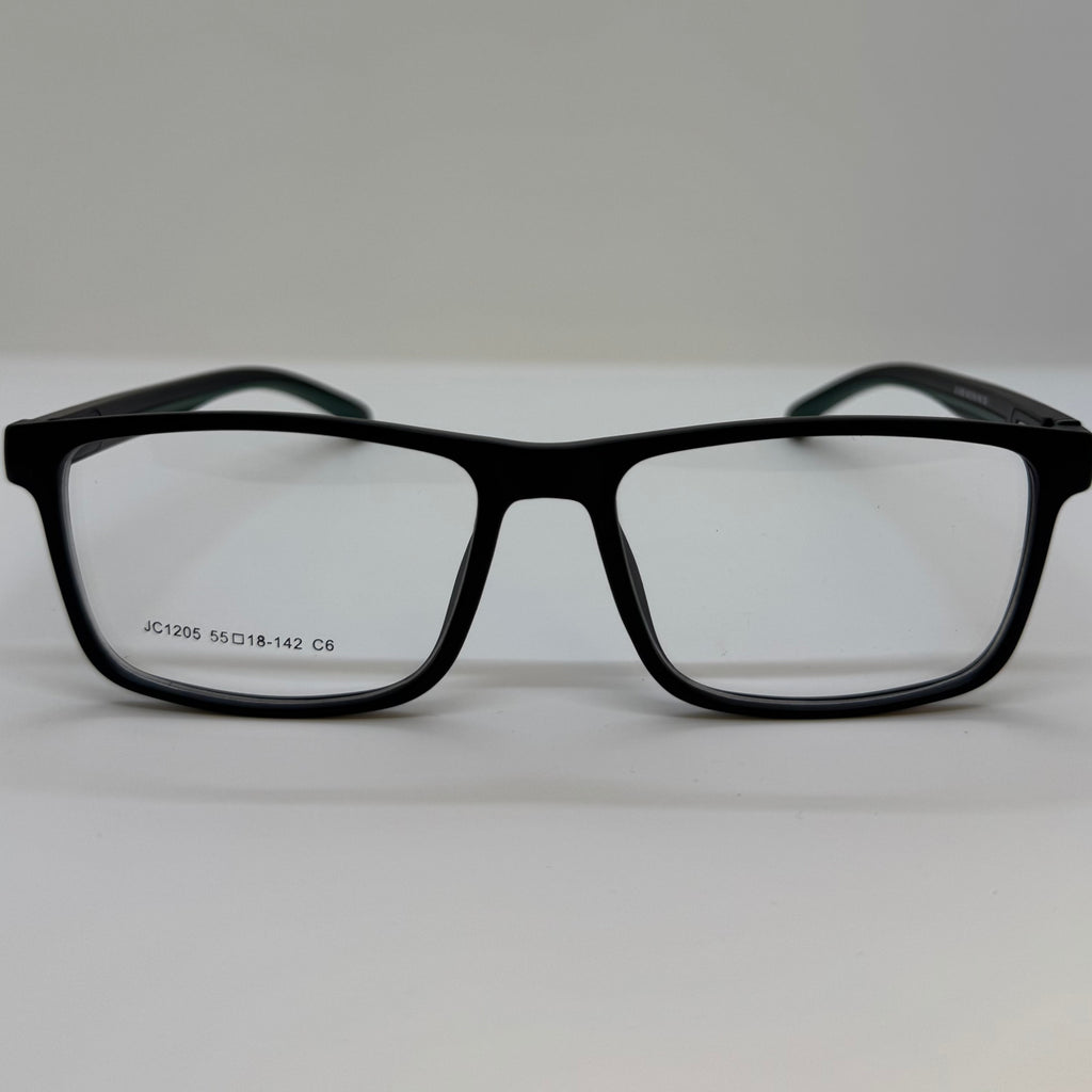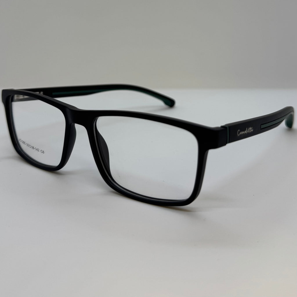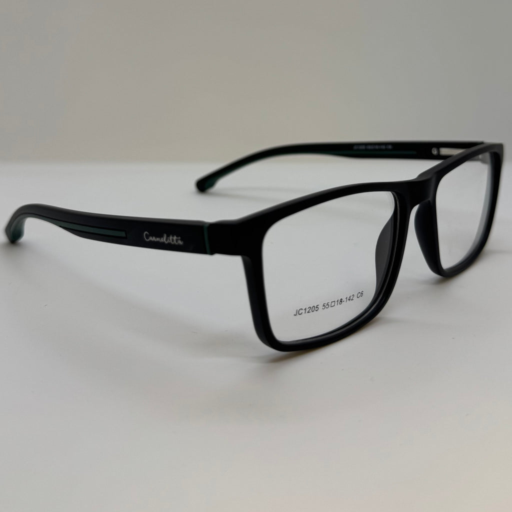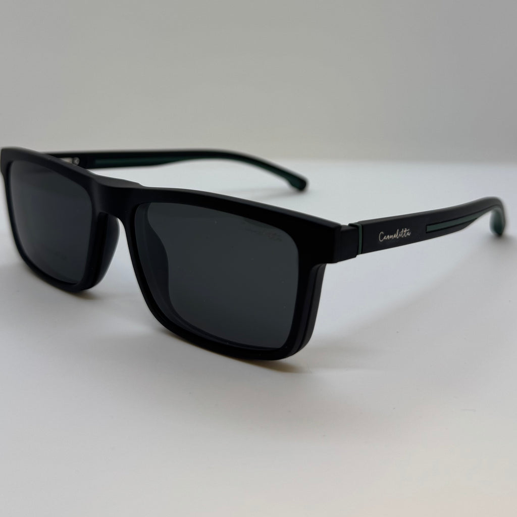 Óculos com armação de grau em acetato preto, hastes com encaixe confortável seguindo a mesma cor preta da parte frontal mas possuindo alguns detalhes minimalistas verde, além de conter clipon em acetato preto.