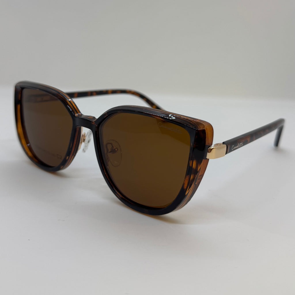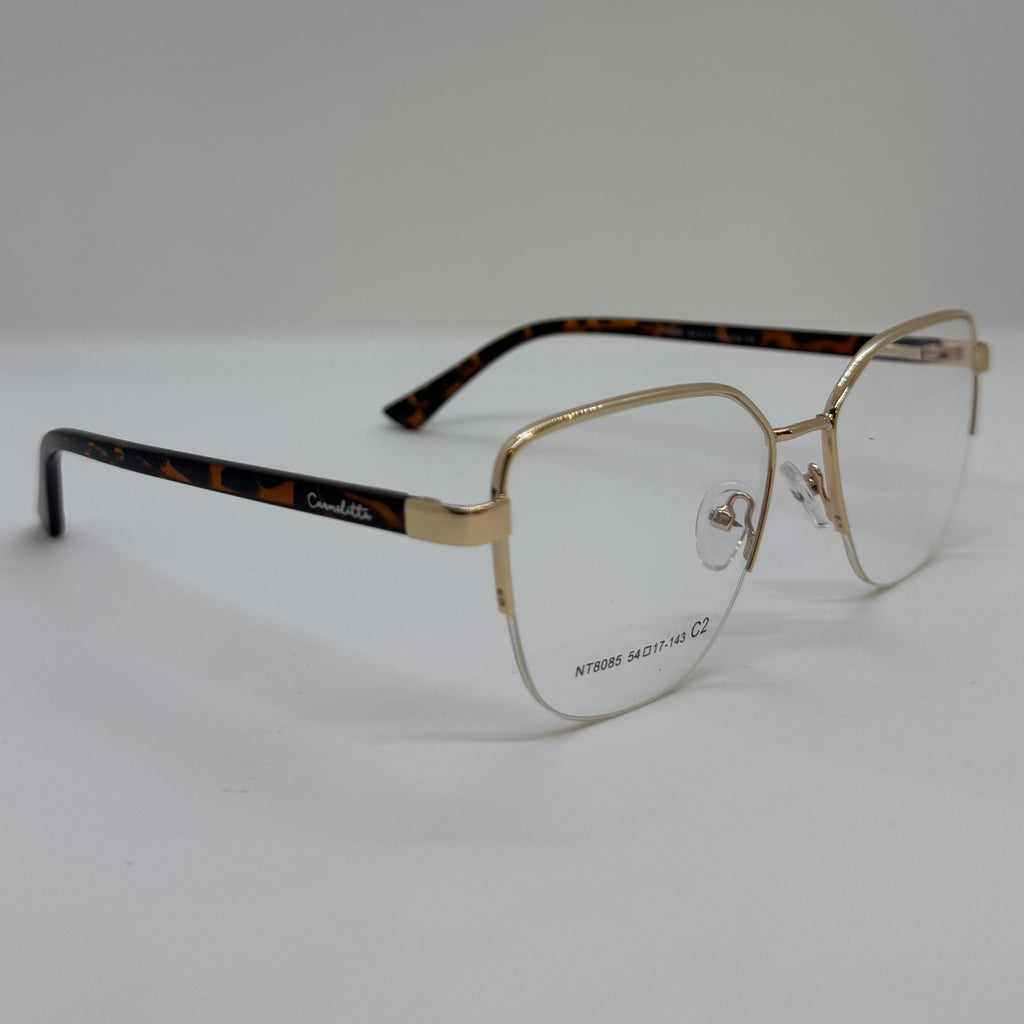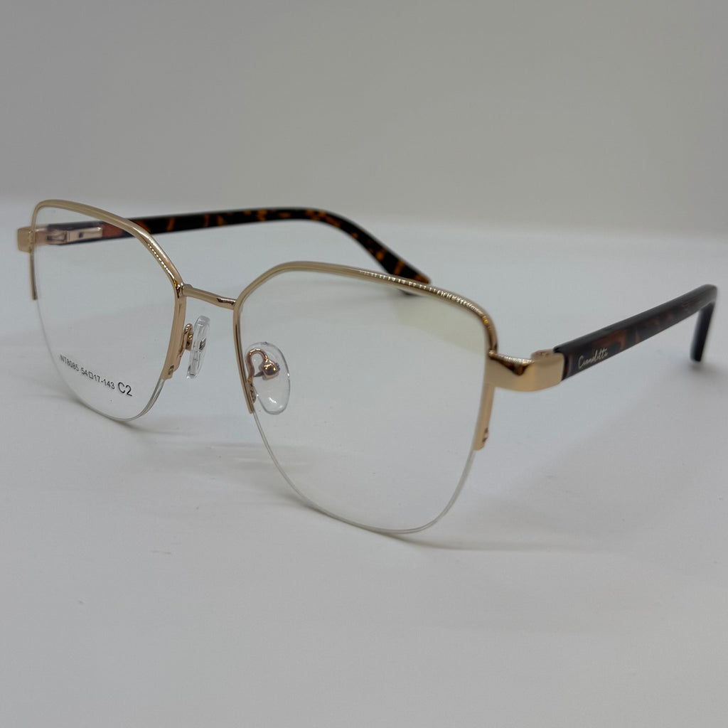 Óculos com hastes em acetato tartaruga e frente em metal dourado.