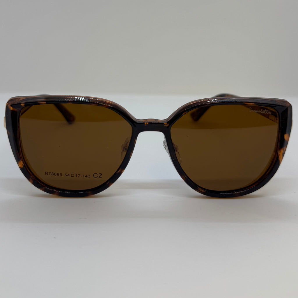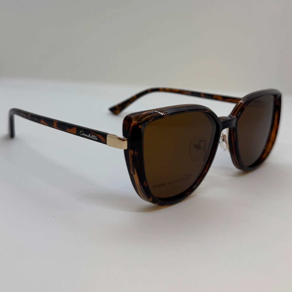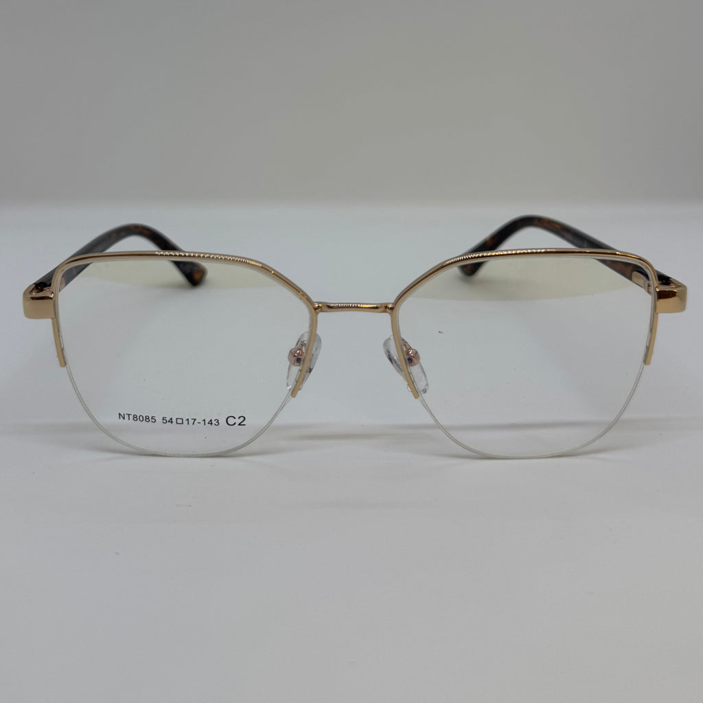 Óculos com hastes em acetato tartaruga e frente em metal dourado.