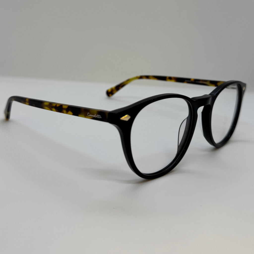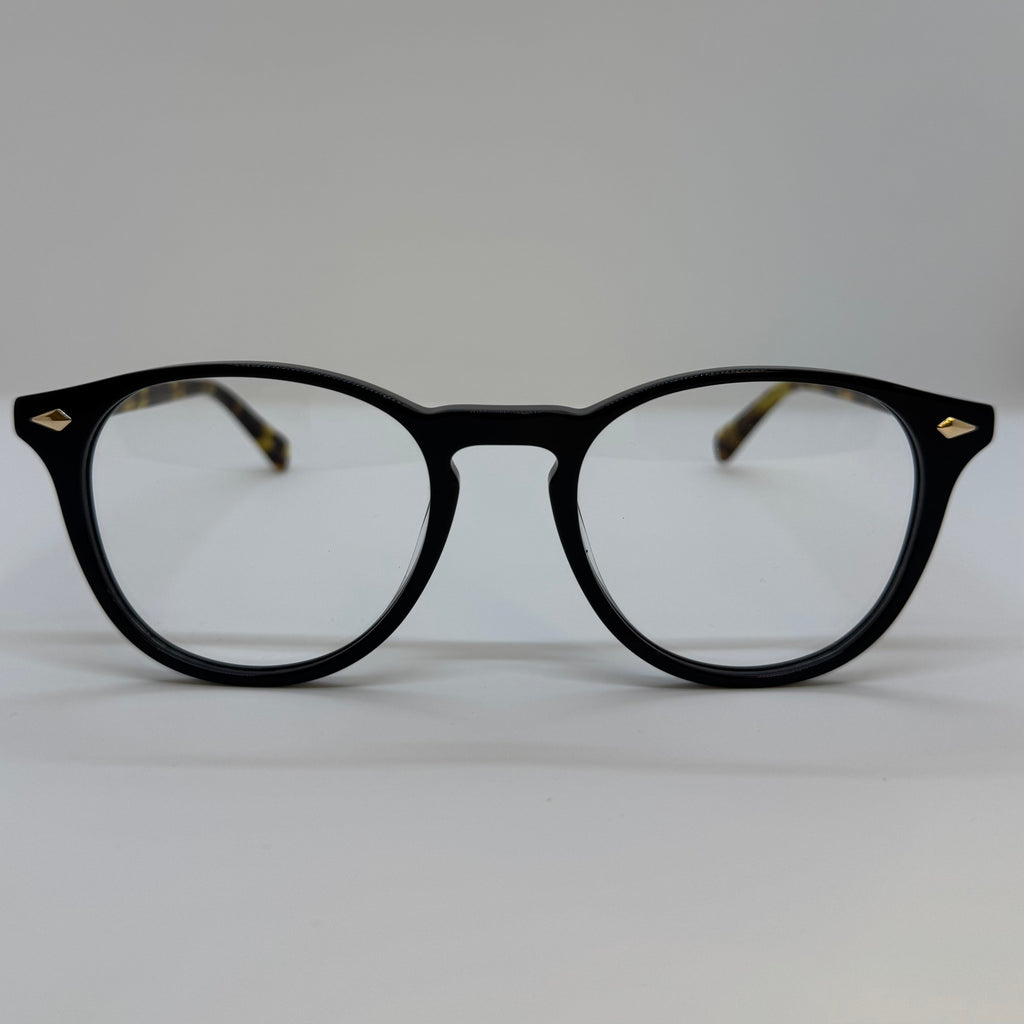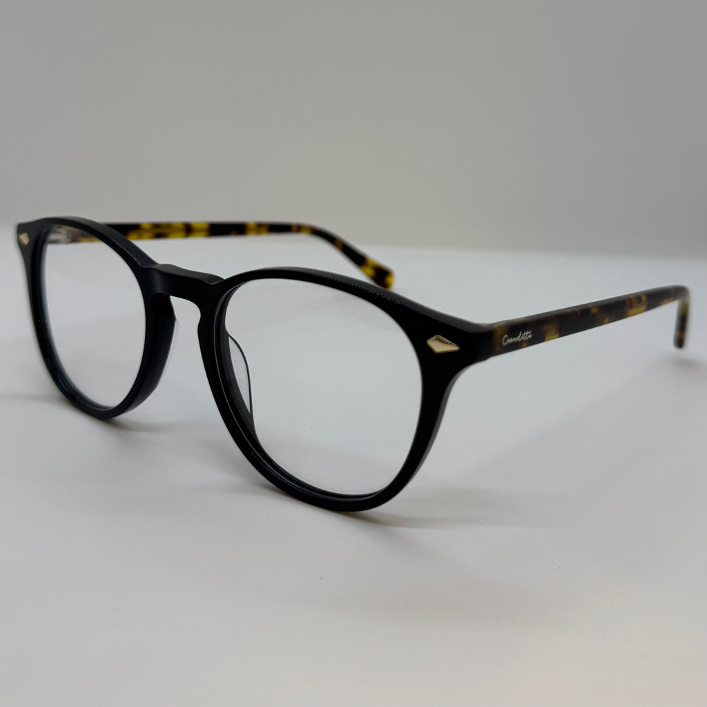 Armação com hastes em acetato tartaruga e frente na cor preto.