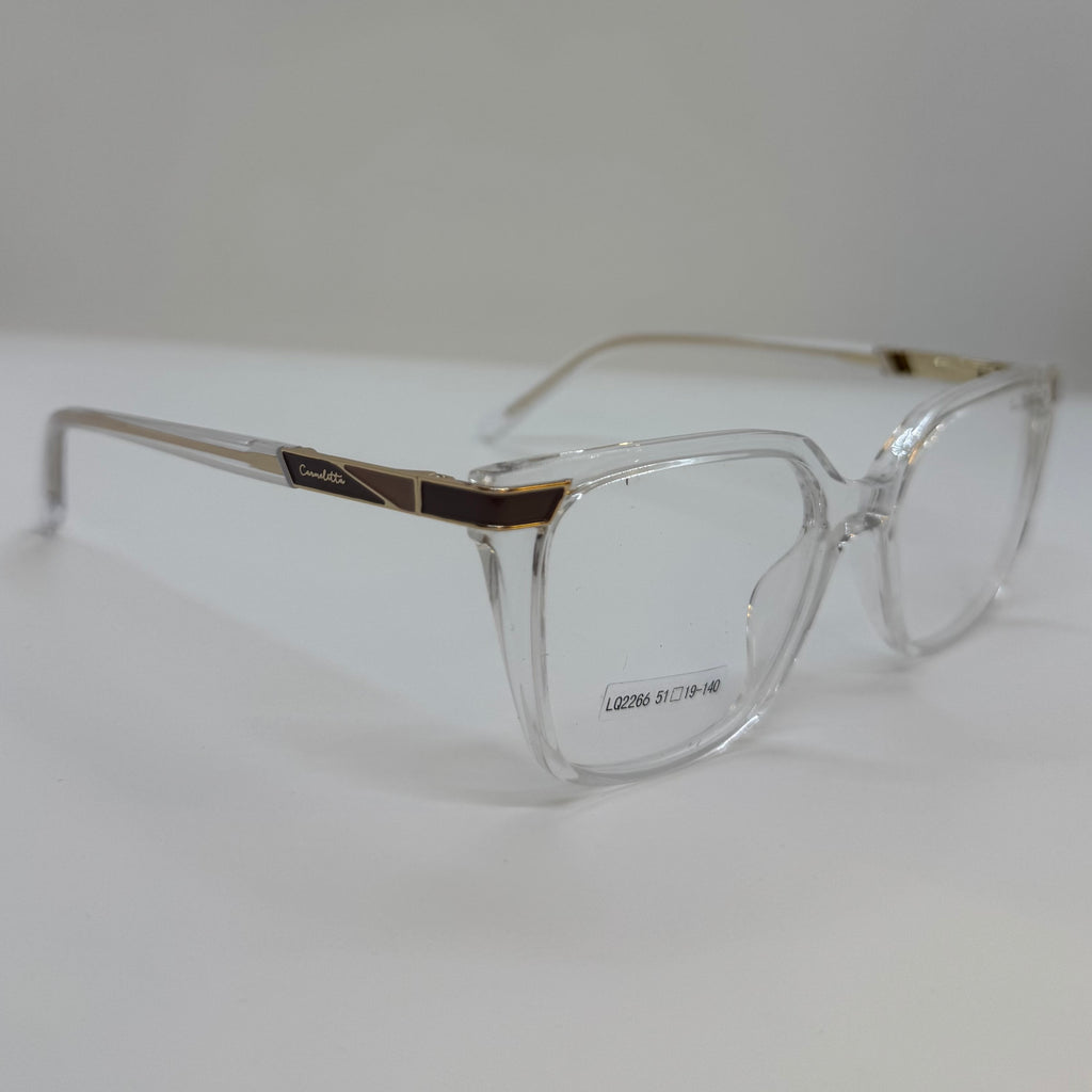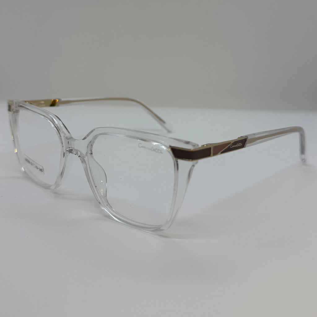 Armação com hastes em acetato transparente com detalhes em metal.