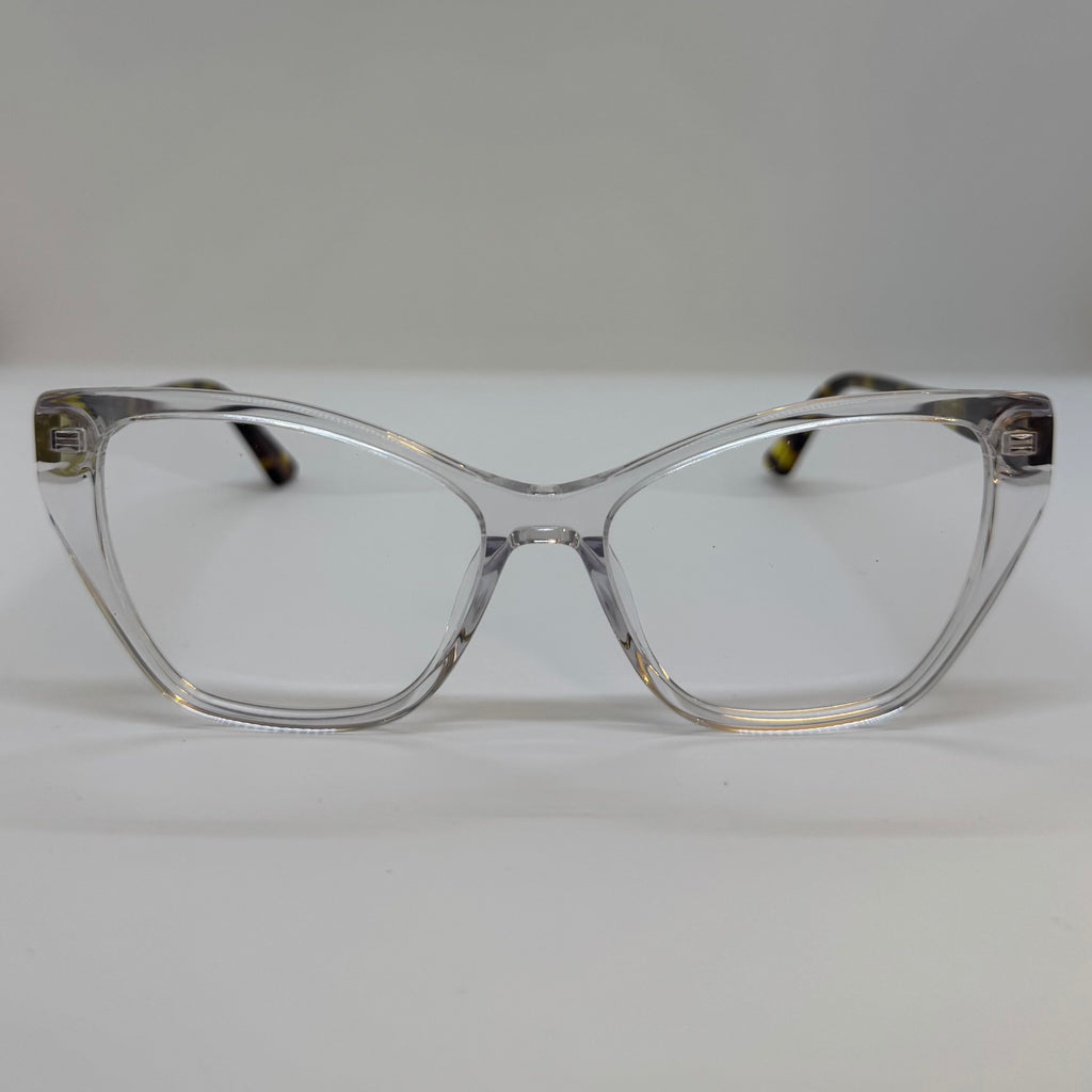 Esse modelo apresenta uma armação frontal transparente, em tom cristalino, que traz leveza e modernidade ao visual. As hastes contrastam com um elegante padrão tartaruga em tons de marrom e amarelo-dourado, adicionando um toque de sofisticação. O design em formato gatinho confere feminilidade e estilo, equilibrando perfeitamente o clássico com o contemporâneo.
