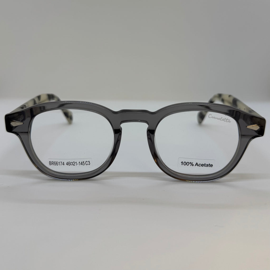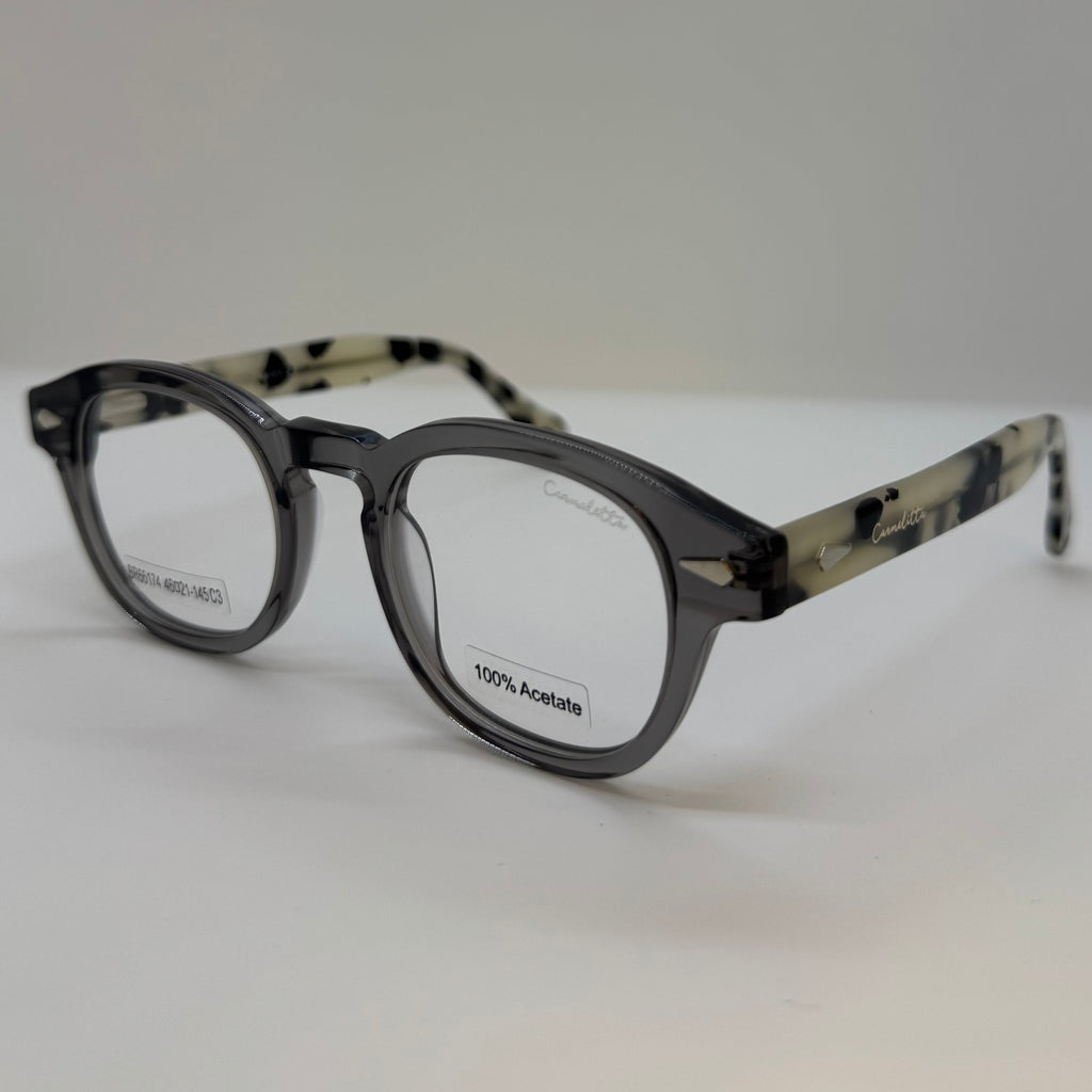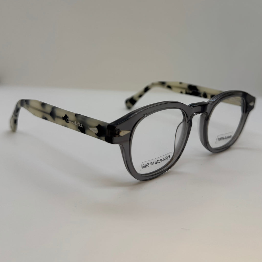 Armação com hastes tartaruga cinza claro e frente cinza translúcido.