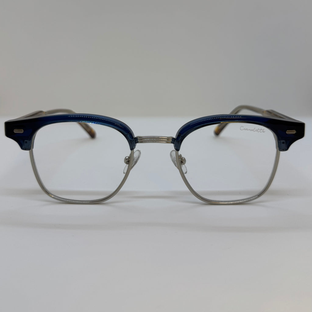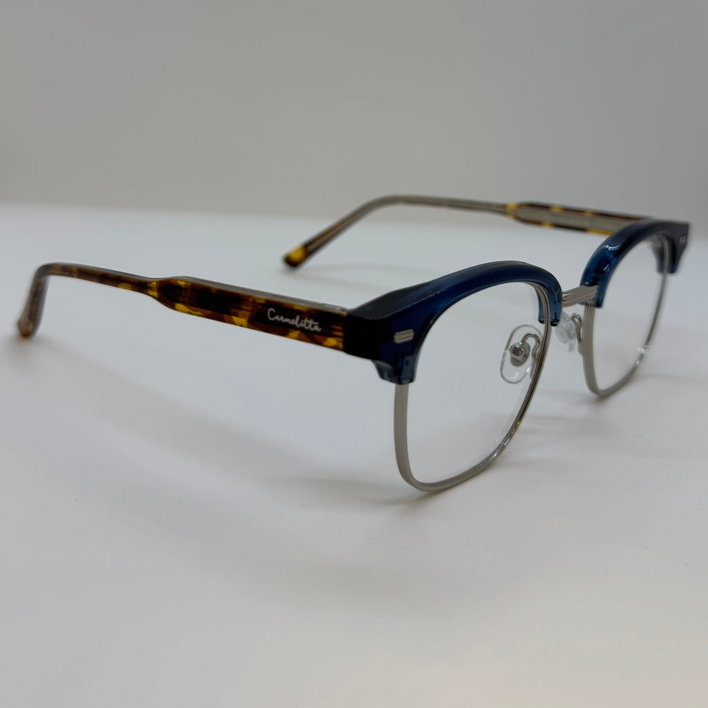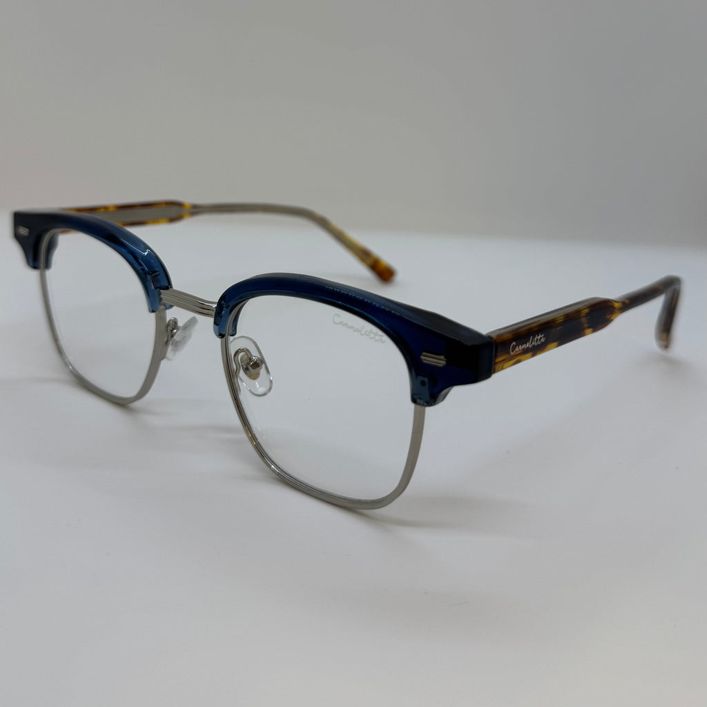 Armação em acetato tartaruga e frente em acetato translúcido azul com metal.