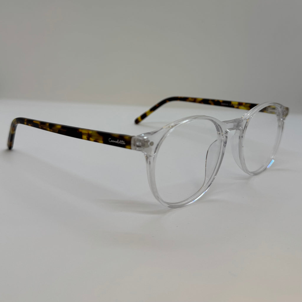 Armação com hastes em acetato tartaruga e frente transparente.