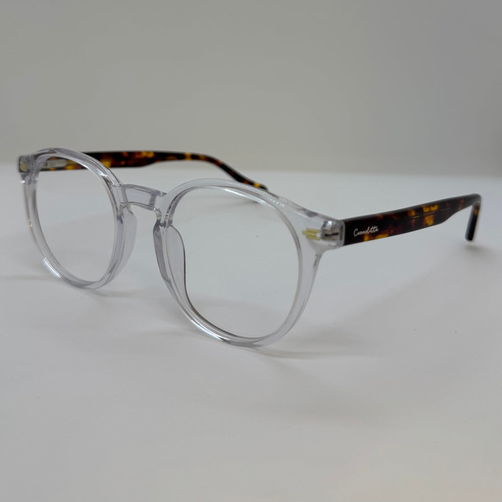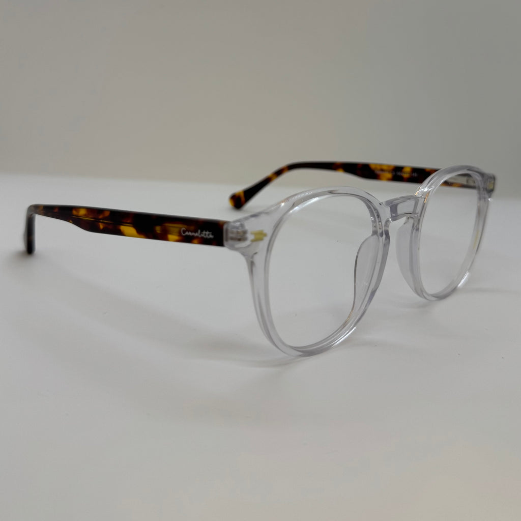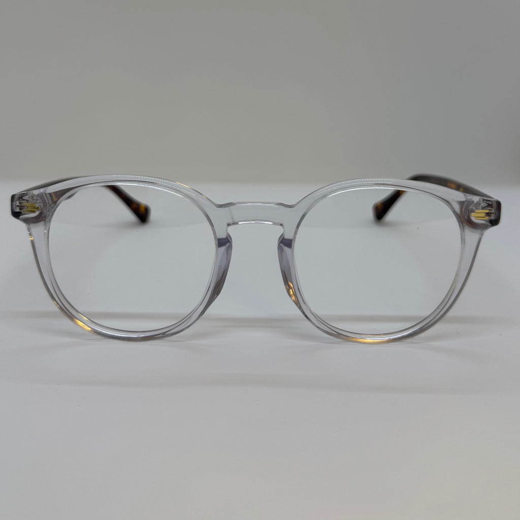 Armação em acetato tartaruga com frente transparente.