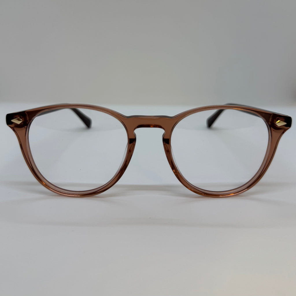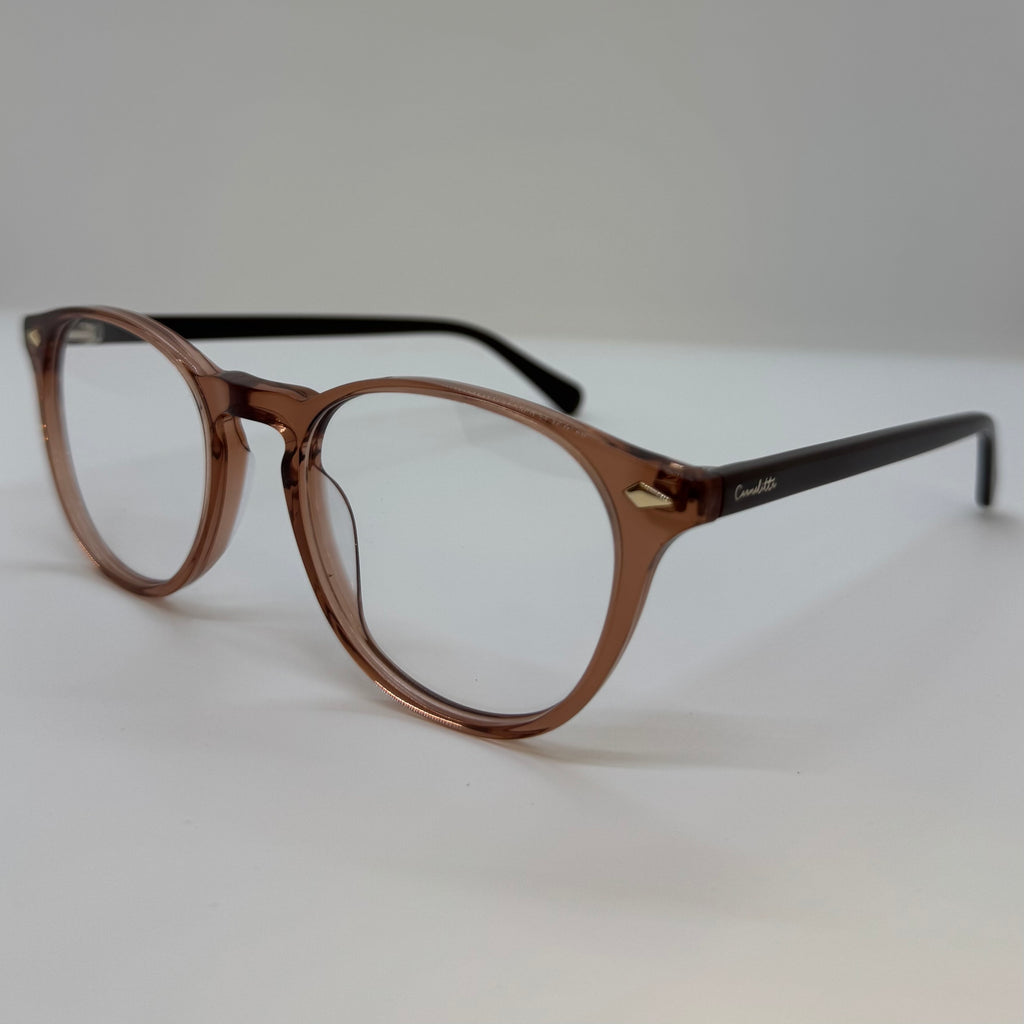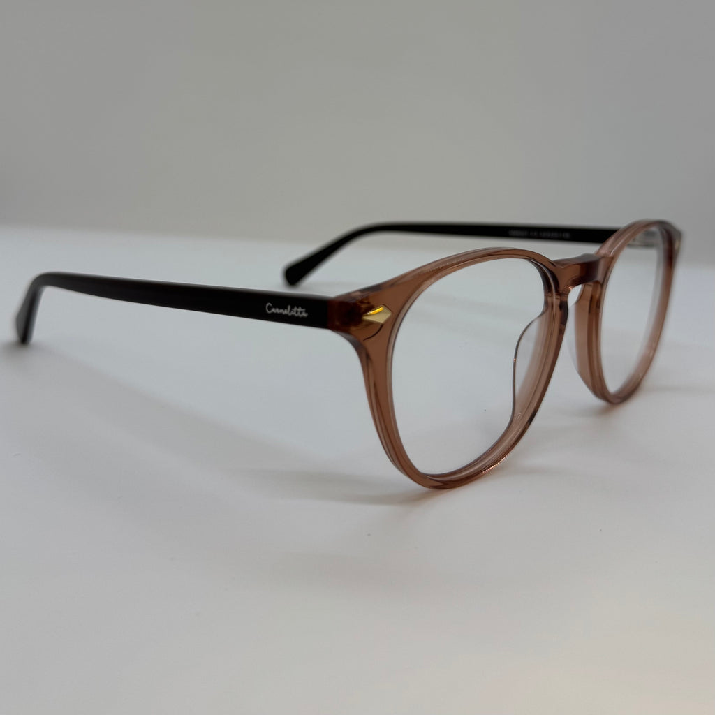 Armação com hastes em acetato preto e frente na cor marrom translúcido.