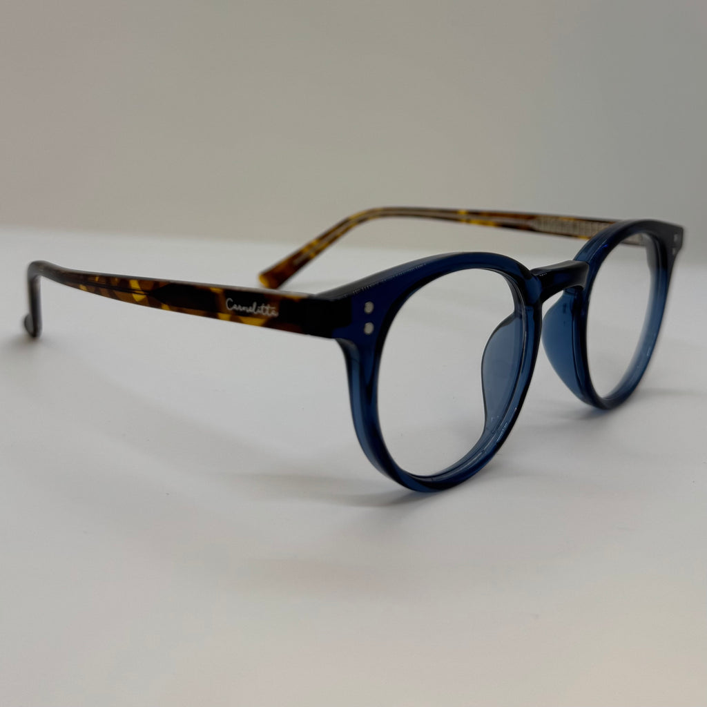 Óculos com hastes em acetato tartaruga e frente azul translúcido.