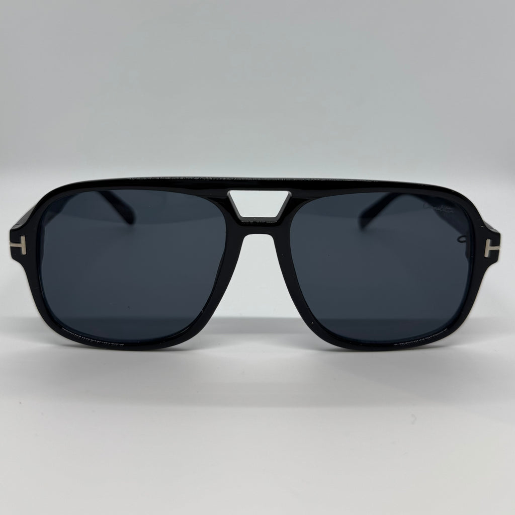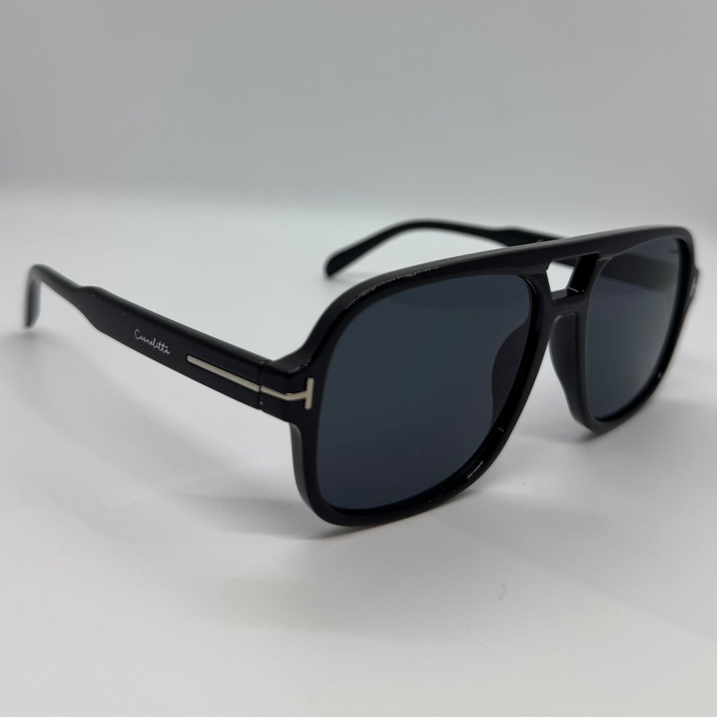 Óculos com hastes em acetato preto com detalhe prata e lente preta.
