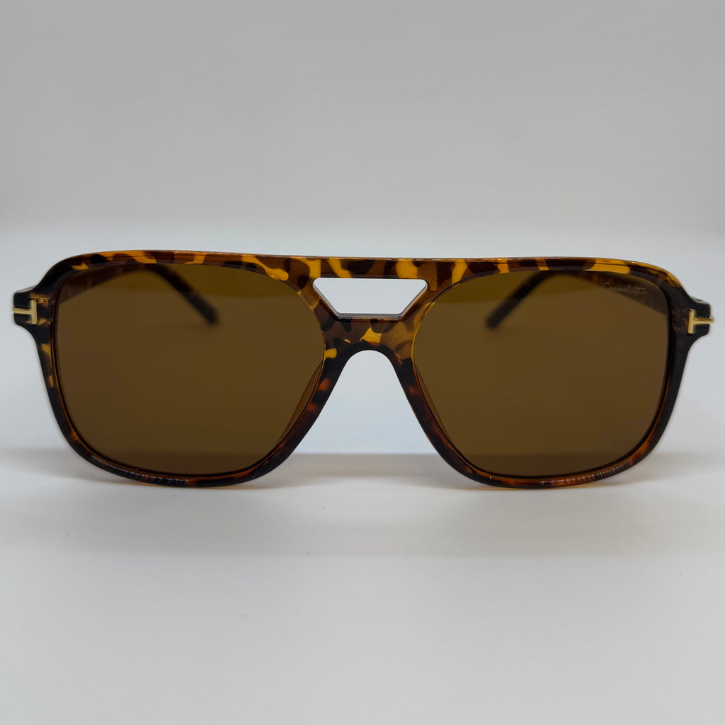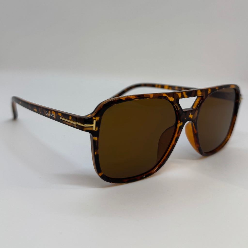 Óculos com hastes em acetato tartaruga com detalhes dourado e lente marrom.