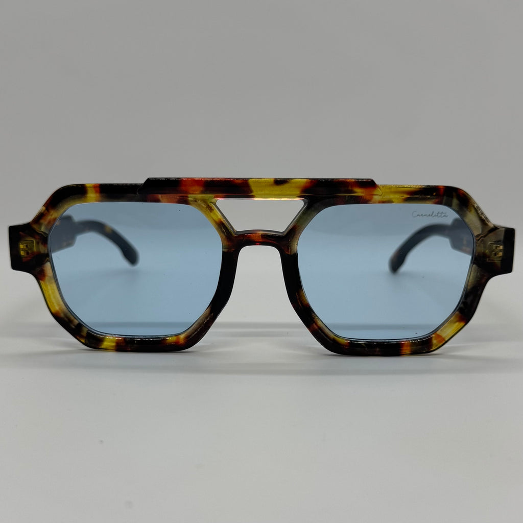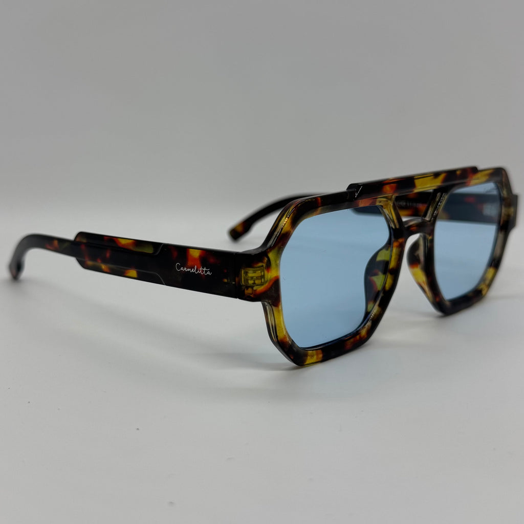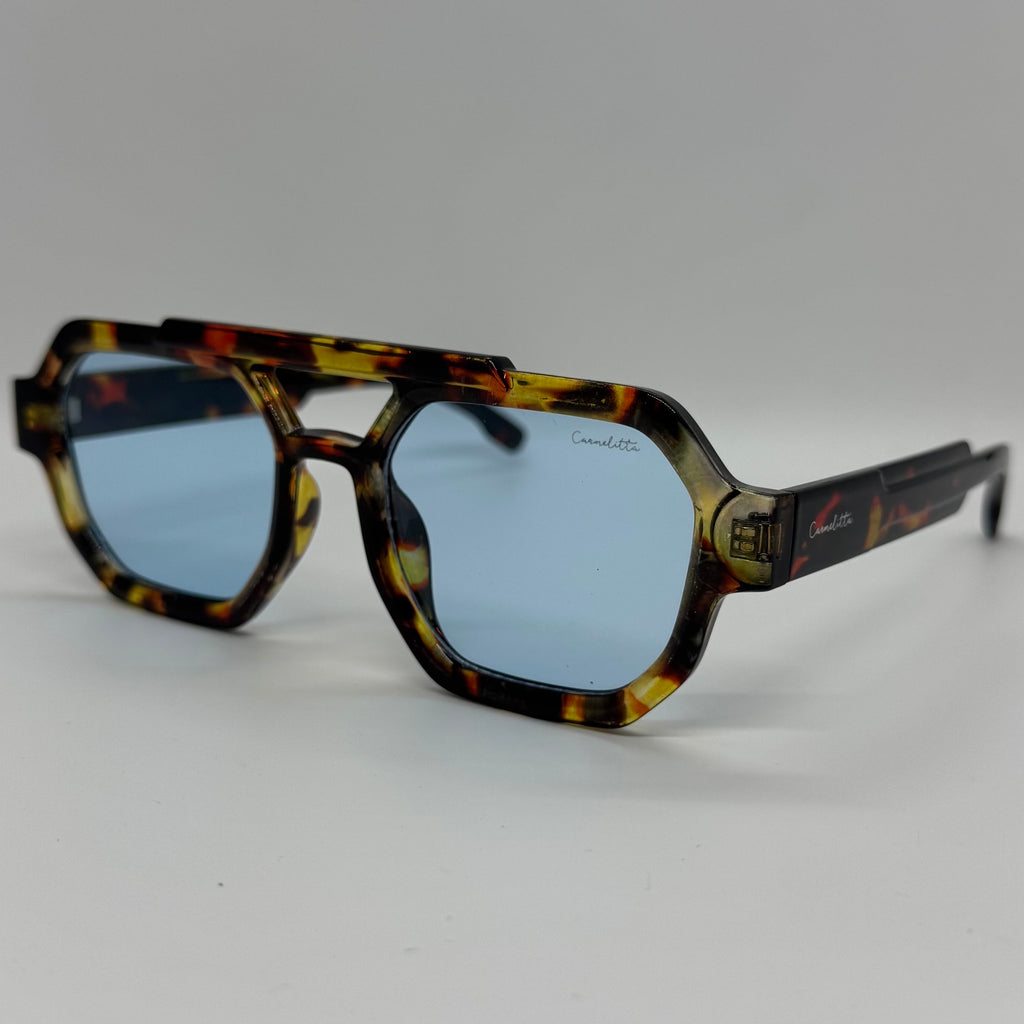 Óculos com hastes em acetato tartaruga com lente azul.