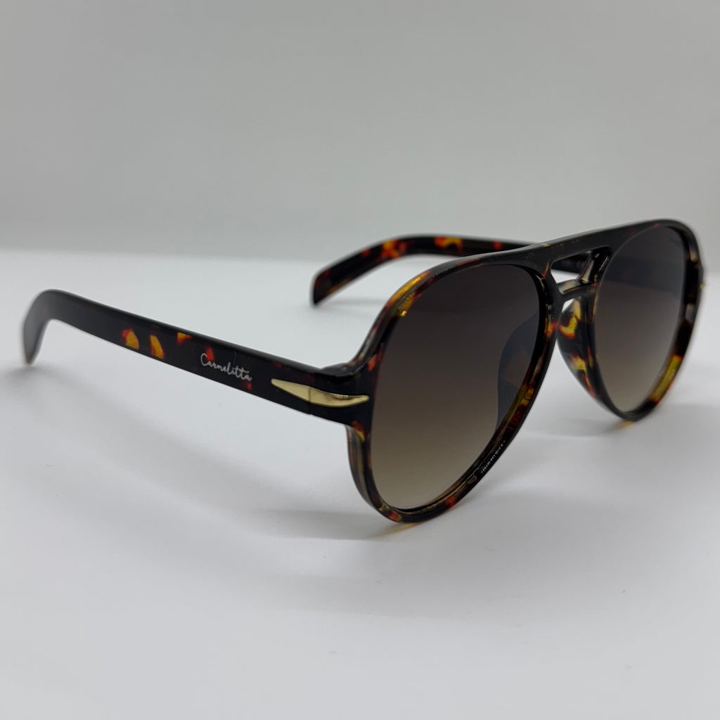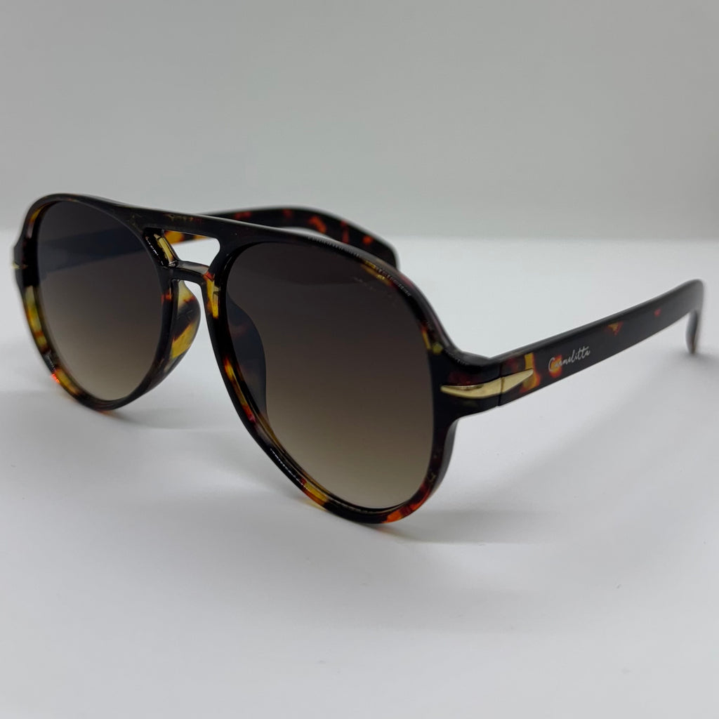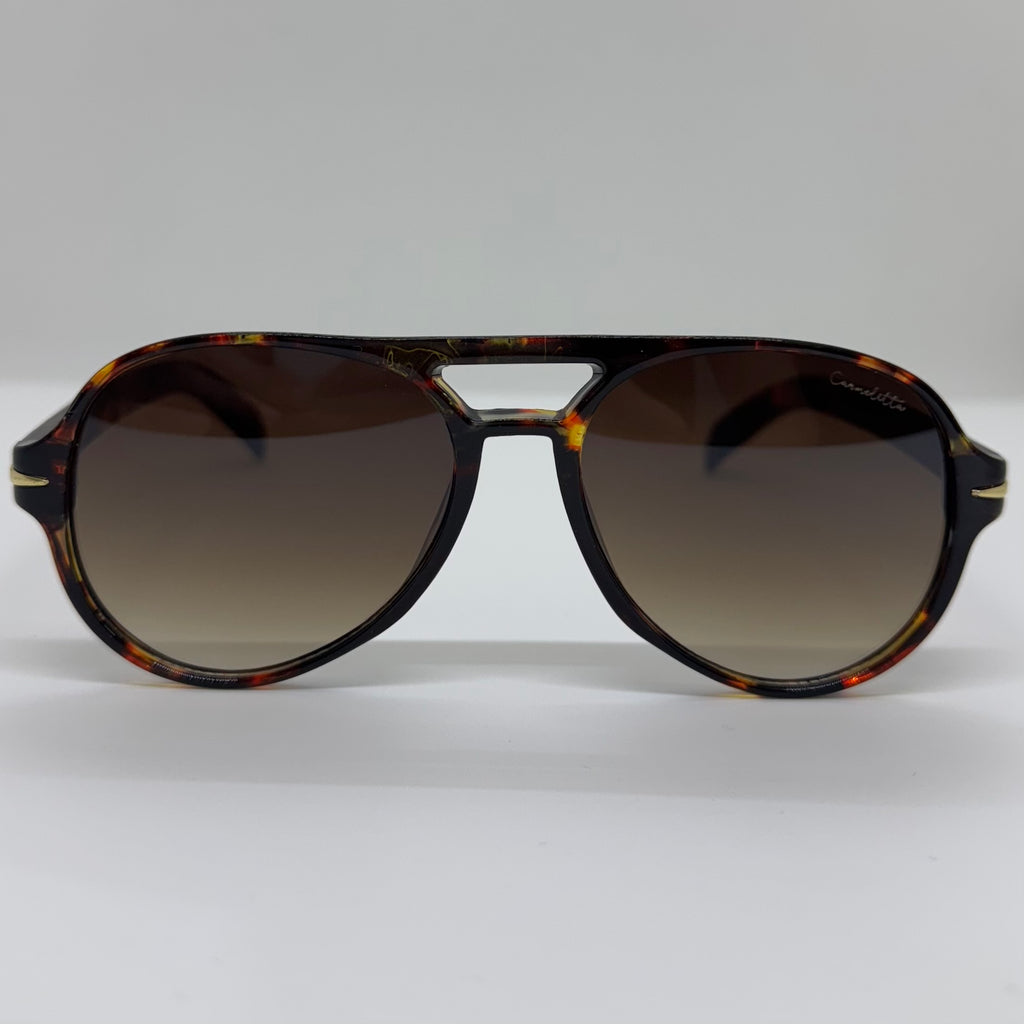 Armação com hastes tartaruga escura com lente marrom degrade.