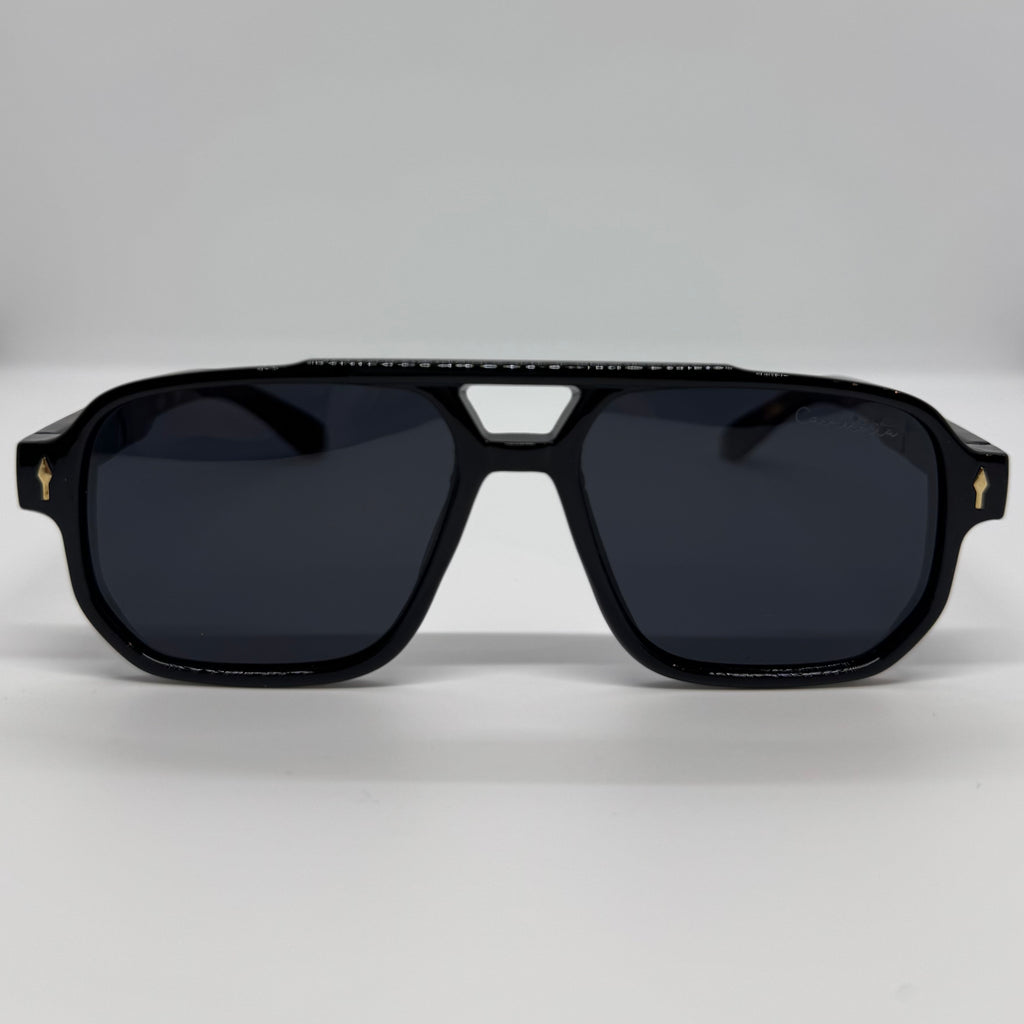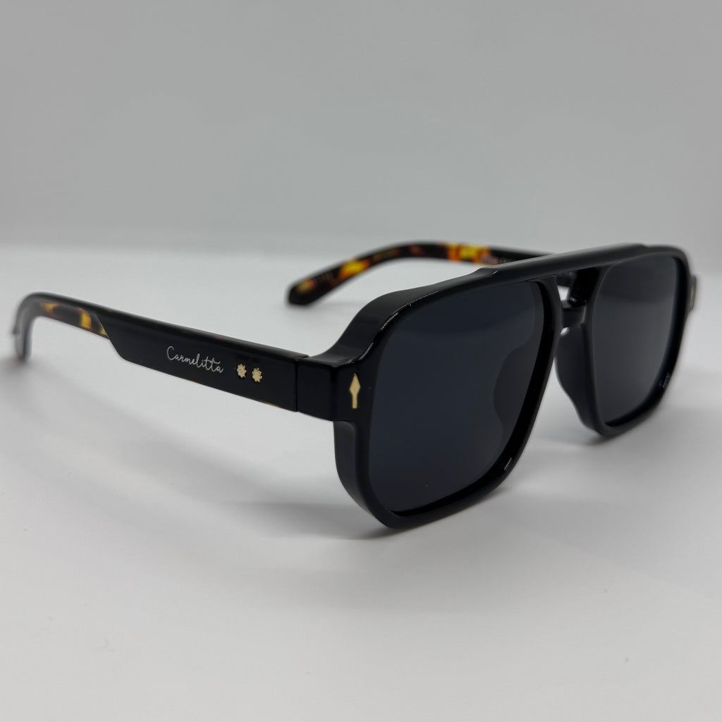 Óculos com hastes em acetato tartaruga, frete na cor preta com lente preta.
