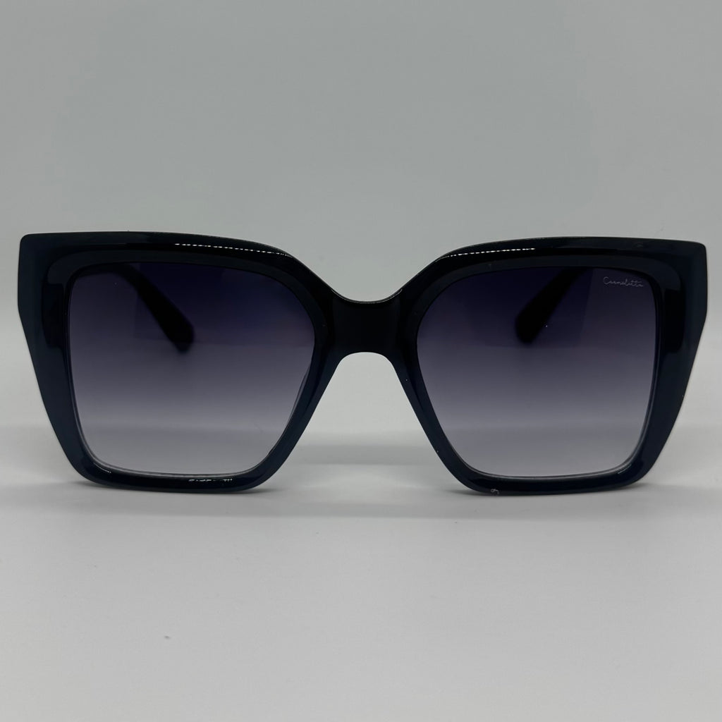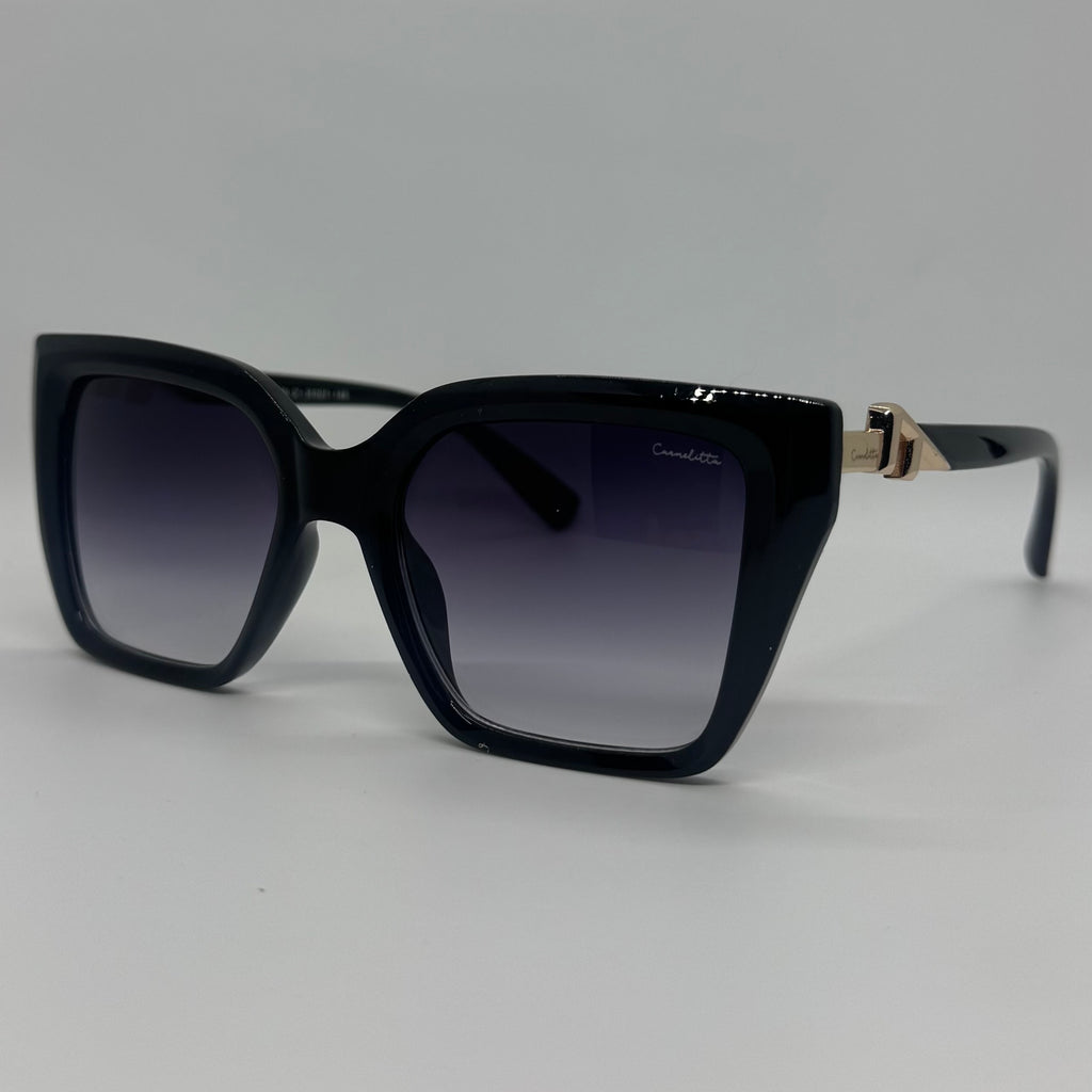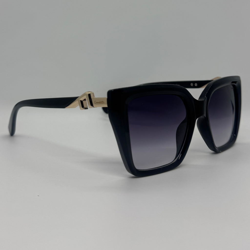 Óculos com hastes em acetato preto com detalhes dourado e lente roxa degrade.