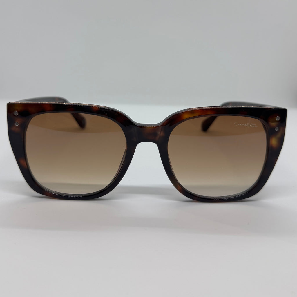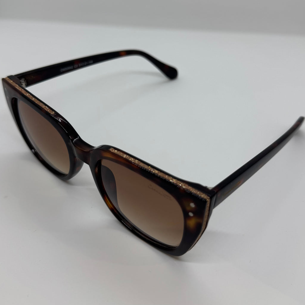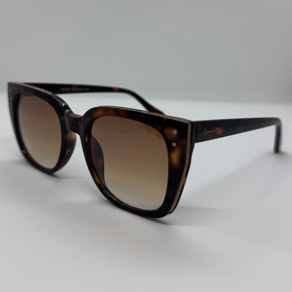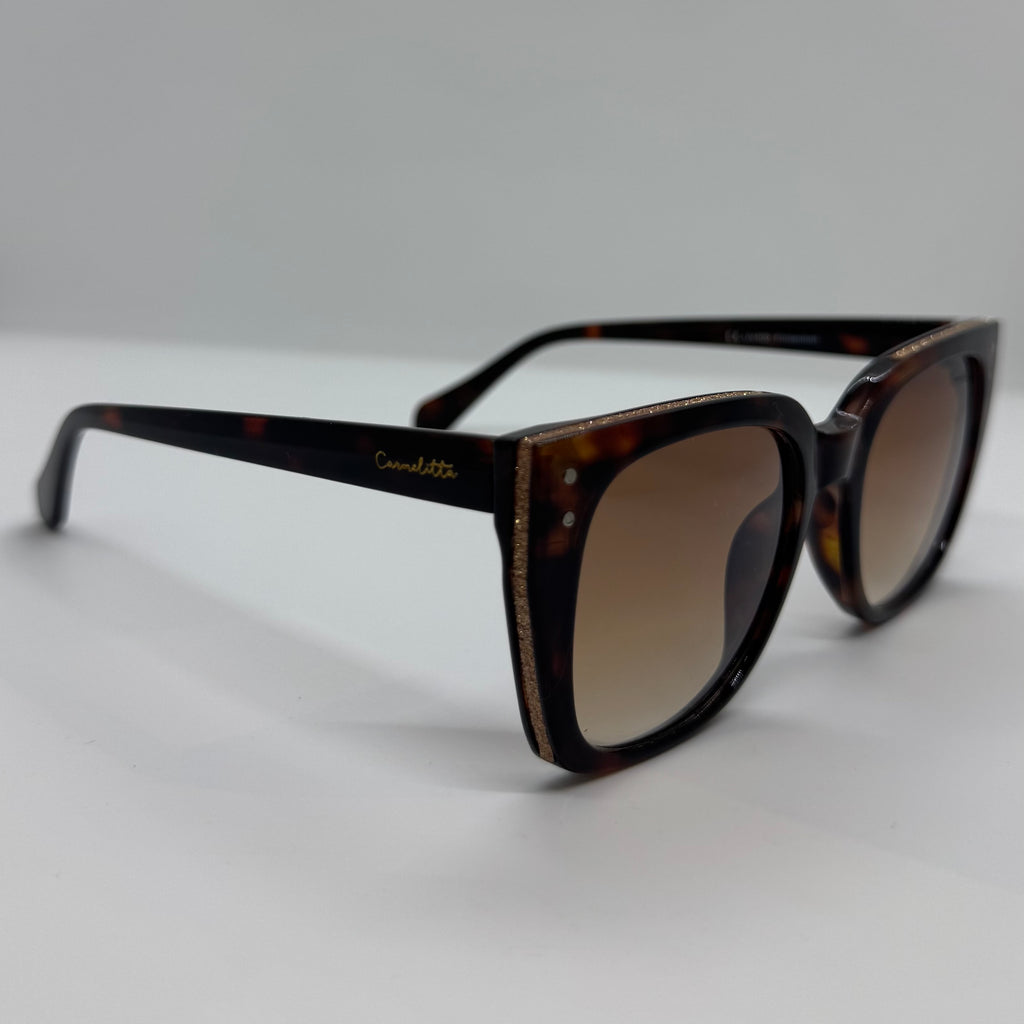 Óculos com armação em acetato tartaruga com detalhes dourados glitter de alta qualidade, hastes firmes em tartaruga, lentes em tom marrom degradê, e possui design quadrado levemente gatinho.
