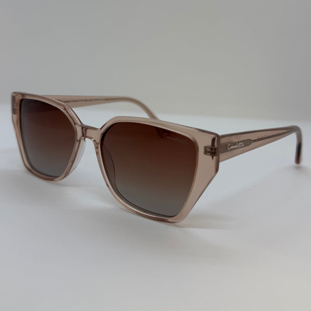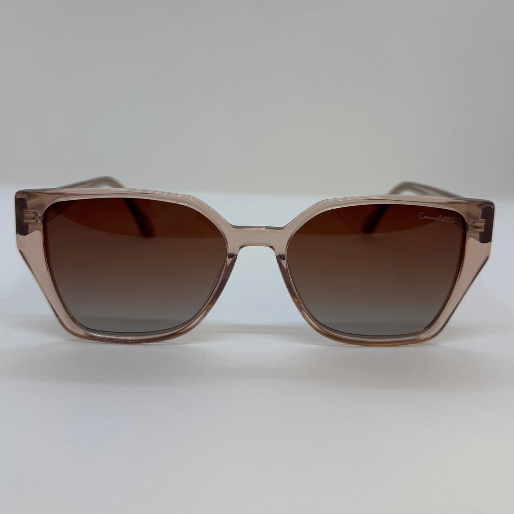 Óculos com armação e hastes rosé translucido em acetato, lentes marrom degradê.