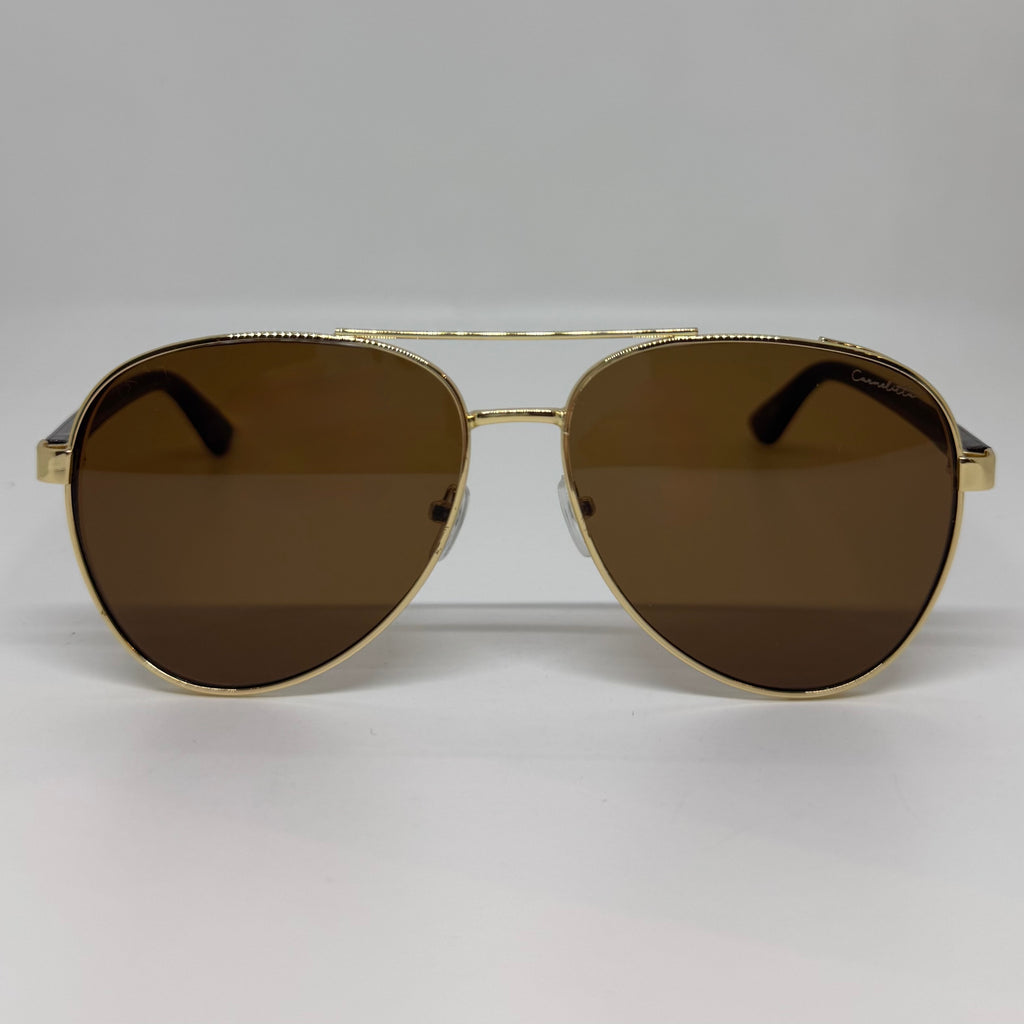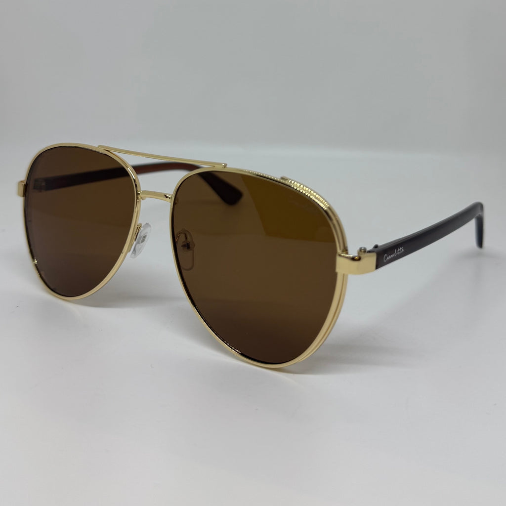 Óculos com hastes em acetato marrom, frente em metal dourado com lente marrom.
