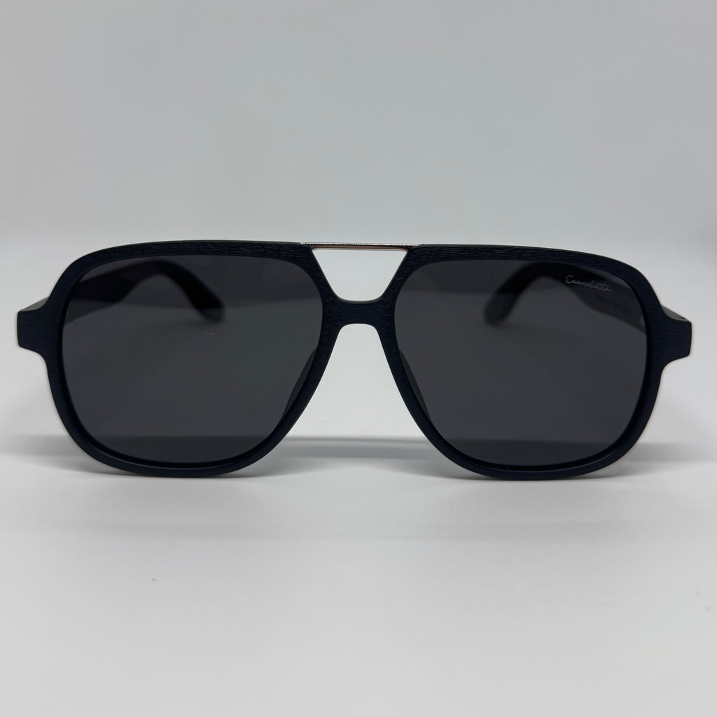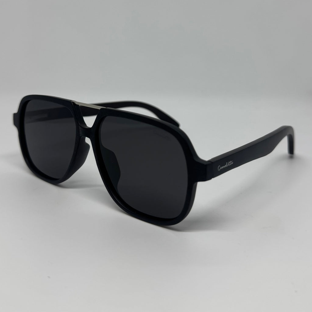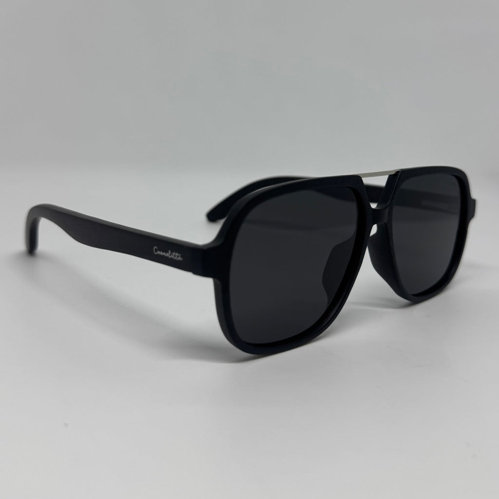 Óculos com hastes em acetato preto, ponte superior em metal e lente preta.