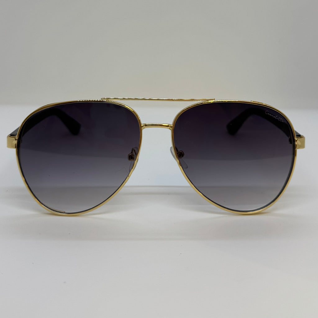 Óculos com armação de estrutura metalica em dourado, lentes em degradê arroxeado, hastes metalicas douradas com finalização em acetato preto, design de ponte dupla que é um detalhe marcante do modelo aviador.