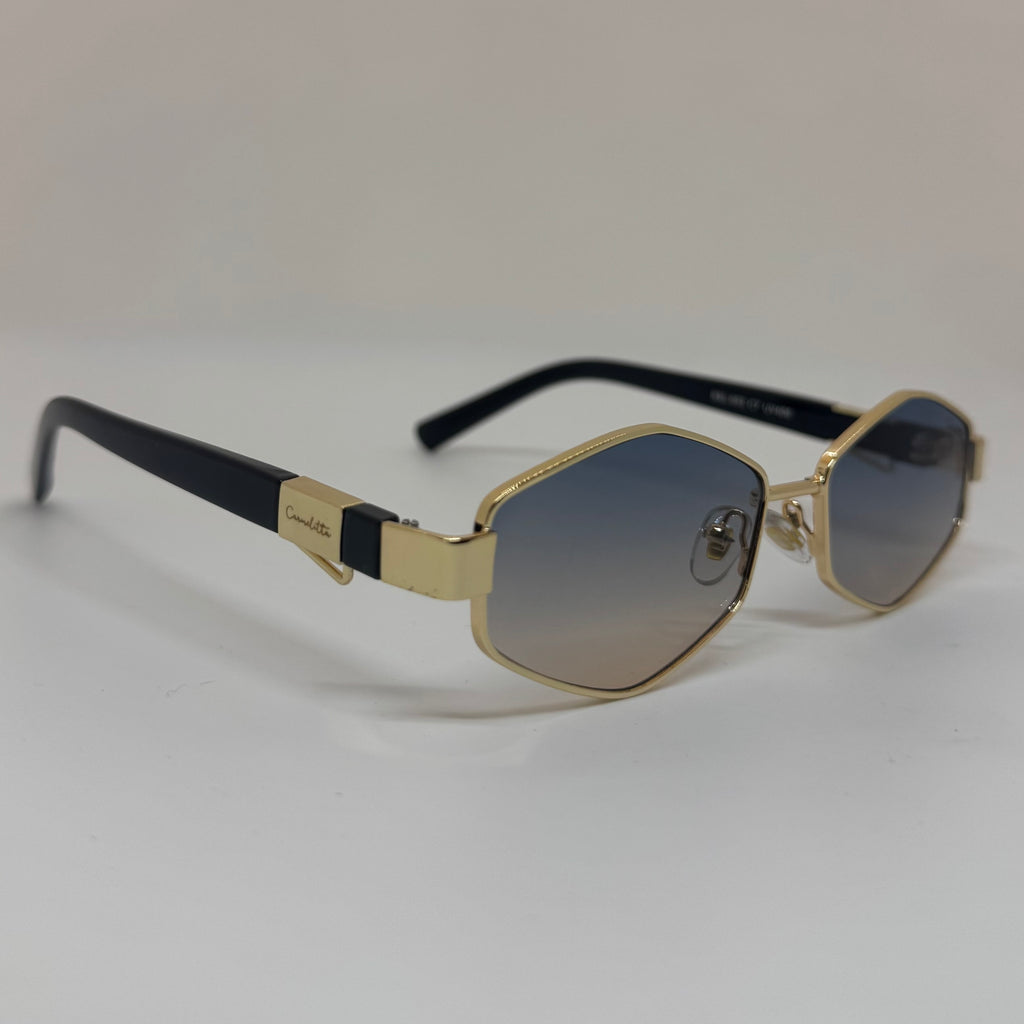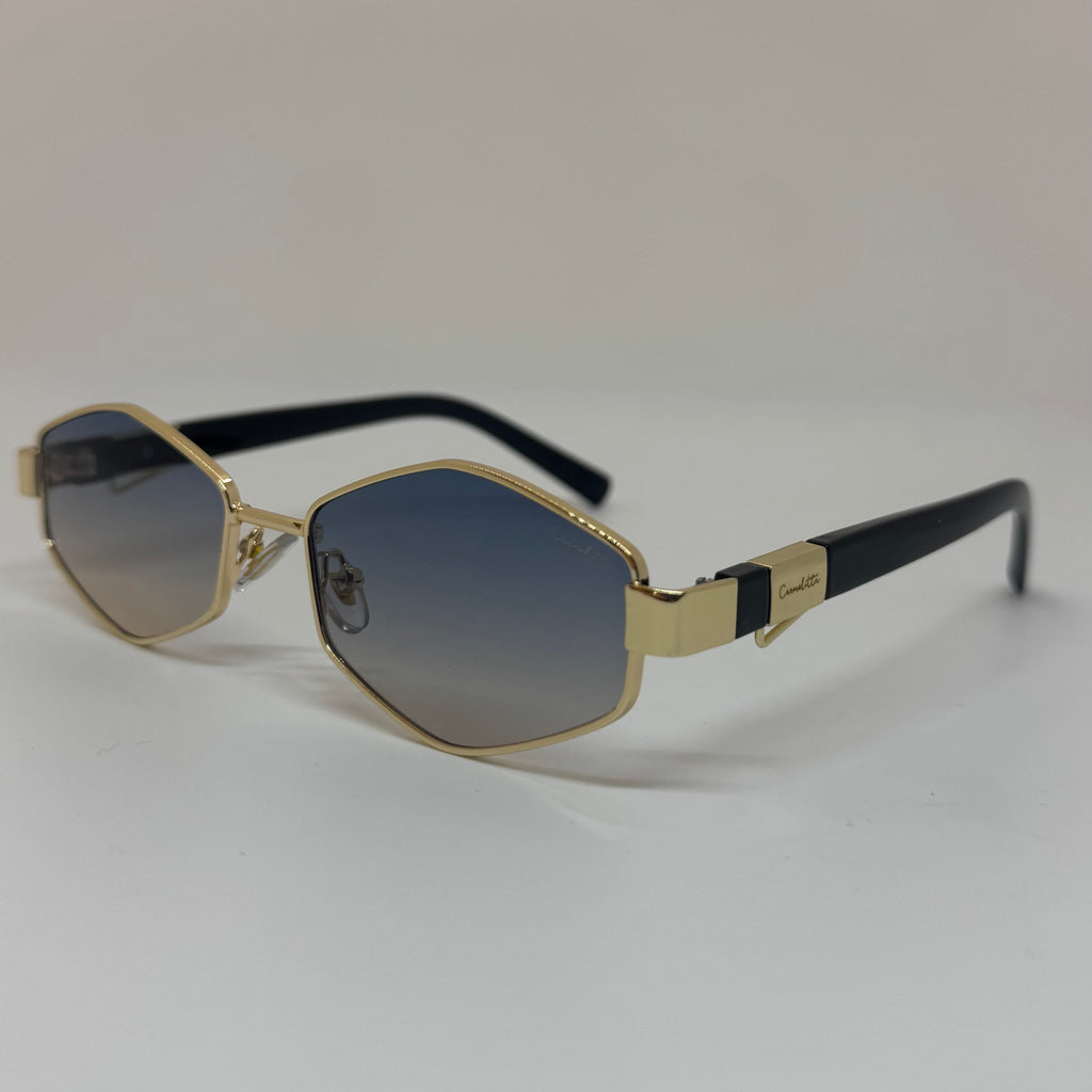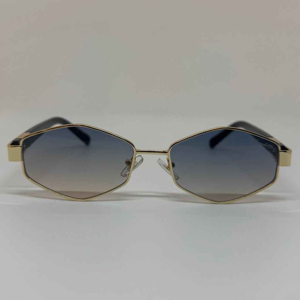 Óculos com hastes em acetato preto com frente em metal dourado e lente azul degrade.