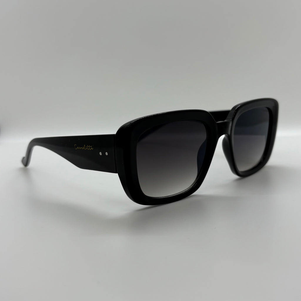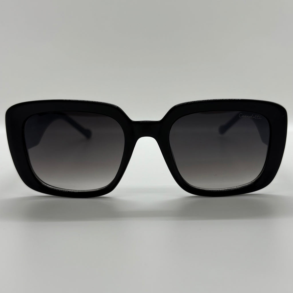 óculos com armação e hastes preta em acetato, lentes preto degradê.
