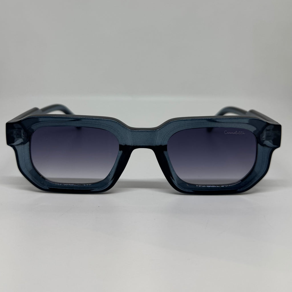 Óculos com hastes em acetato azul translúcido com lente roxa degrade.