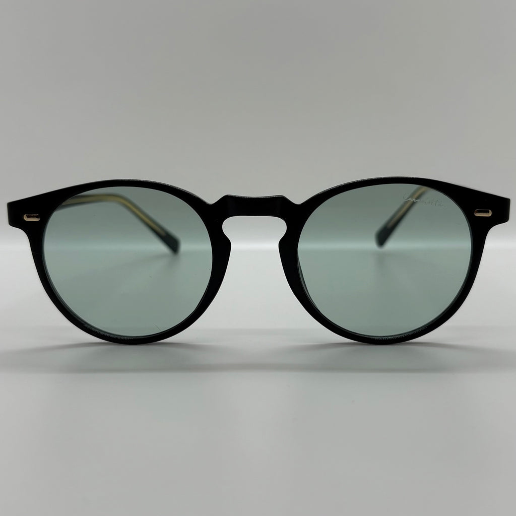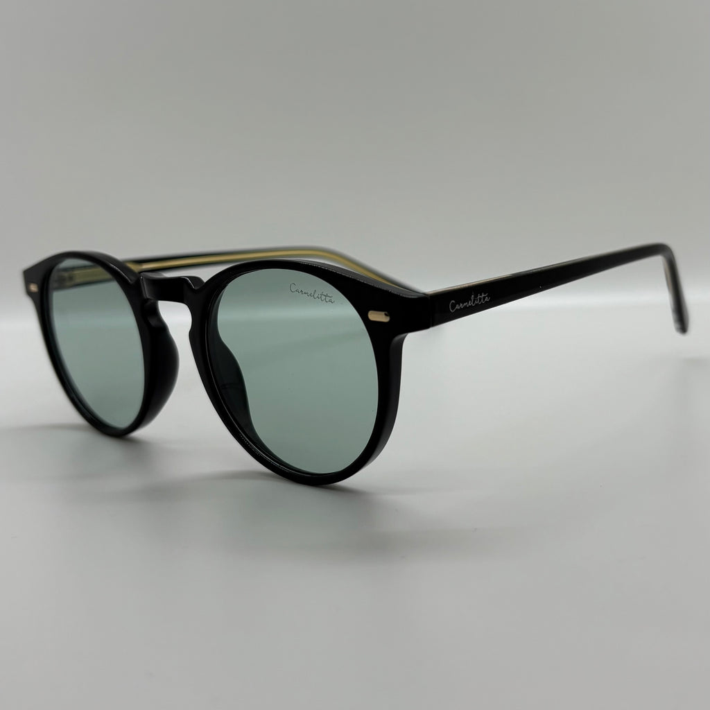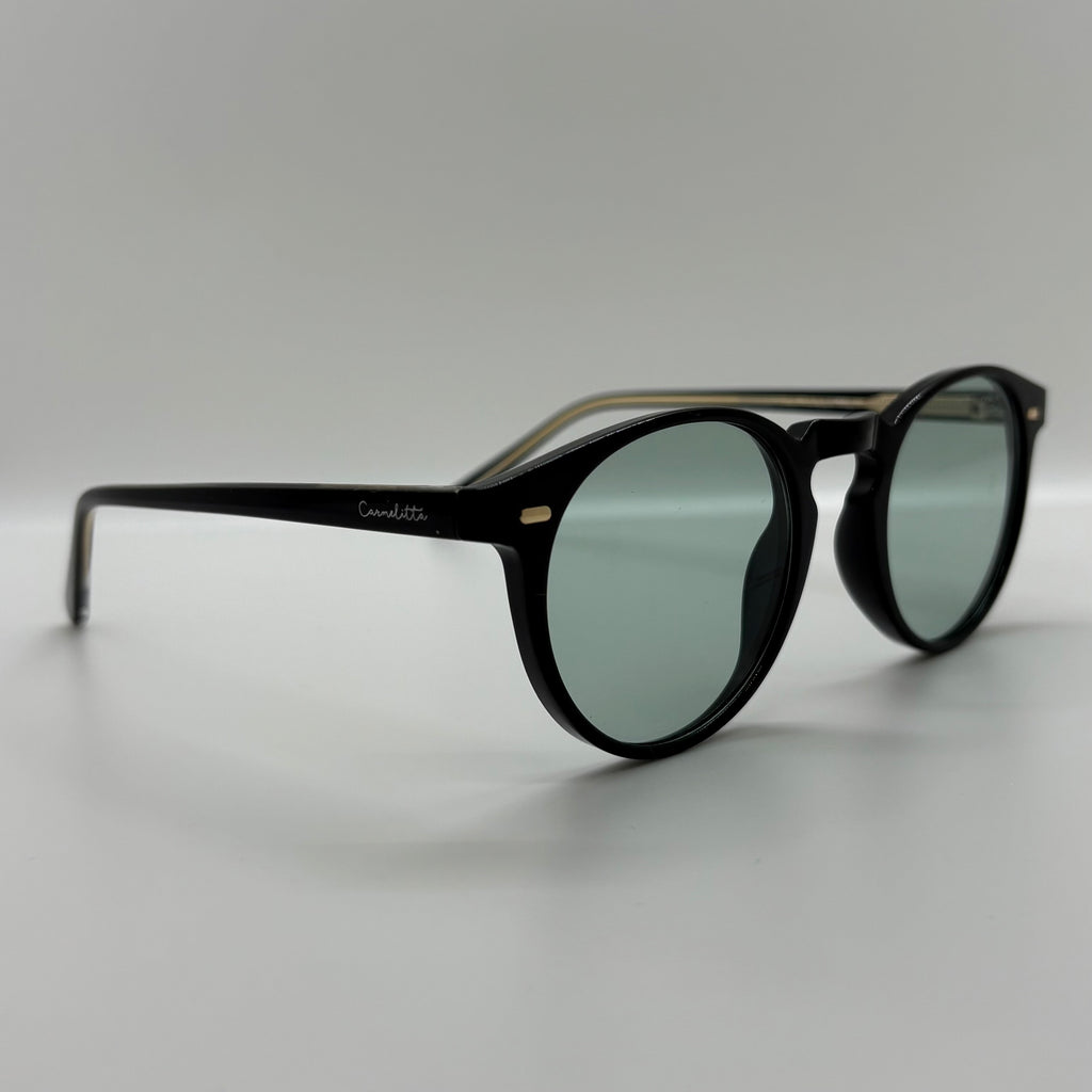 óculos com hastes e armação preta em acetato, e lente verde claro.