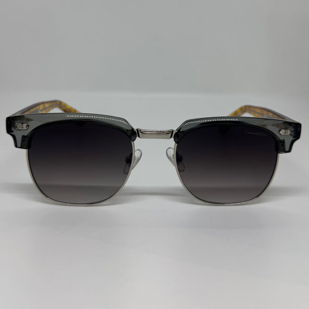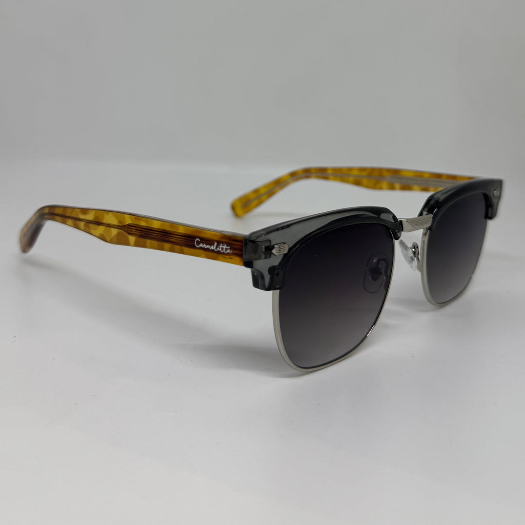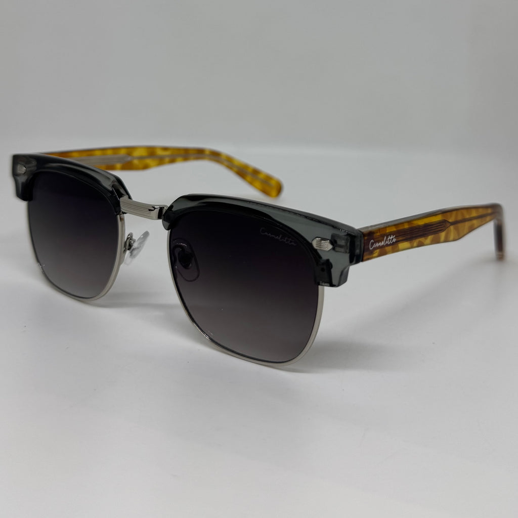 Óculos com hastes em acetato tartaruga com frente em acetato marrom e lente roxa degrade.