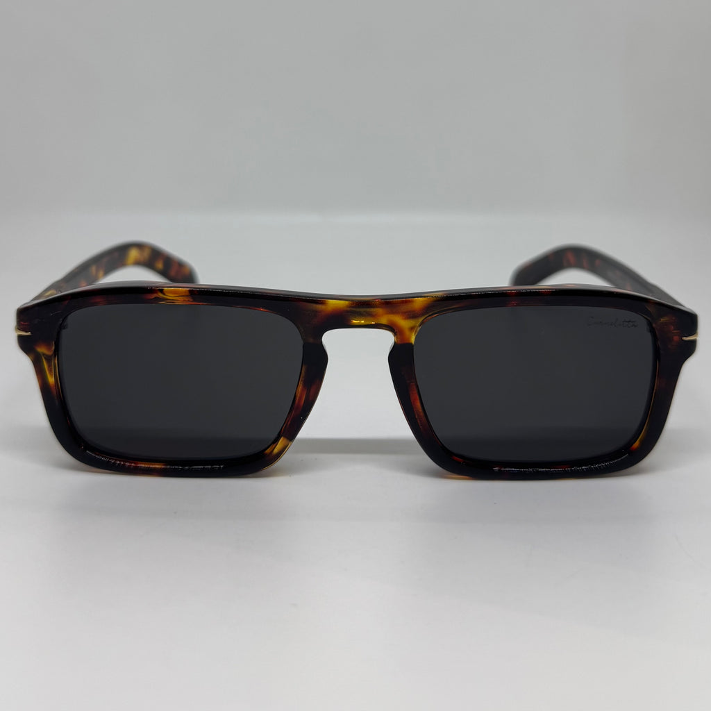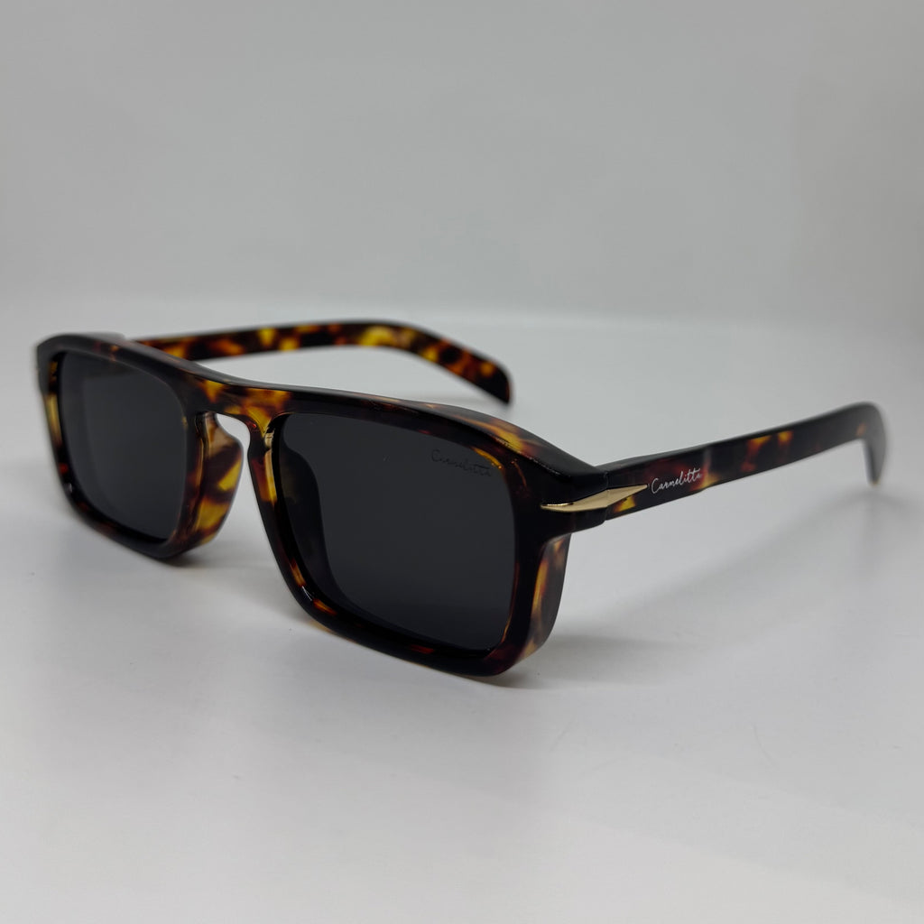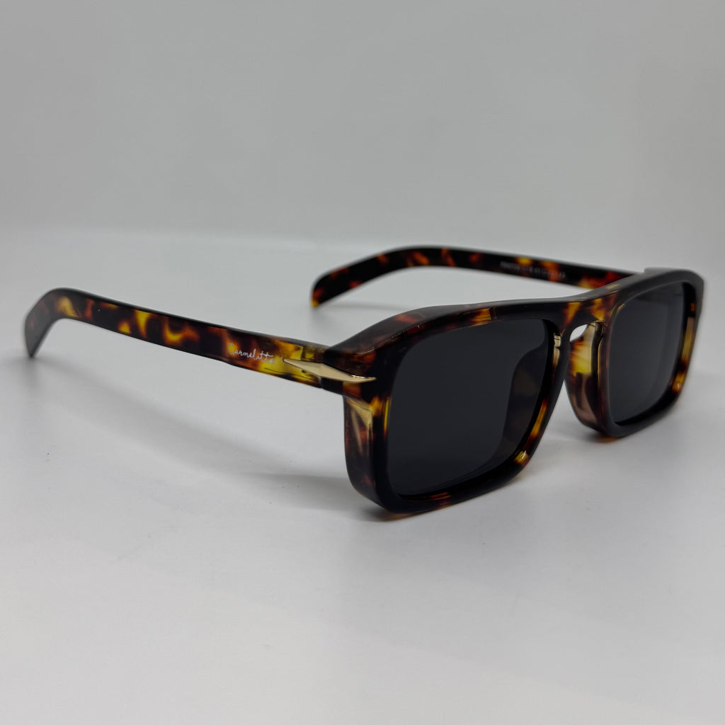 Óculos com hastes em acetato tartaruga escuro com lente preta.