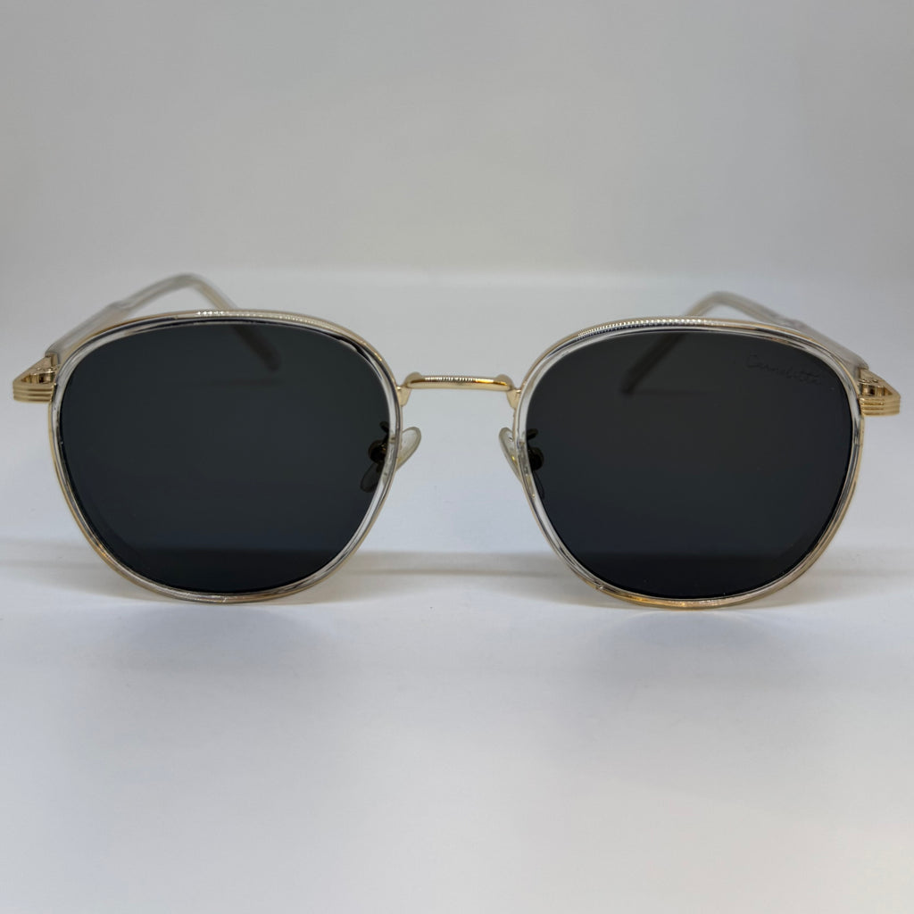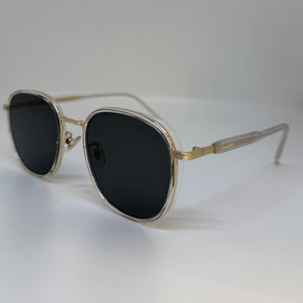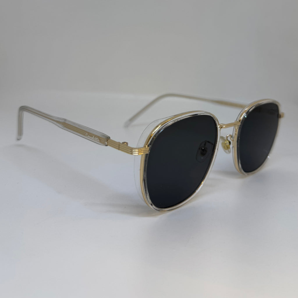 Óculos com hastes em acetato transparente, metal dourado e lente preta.