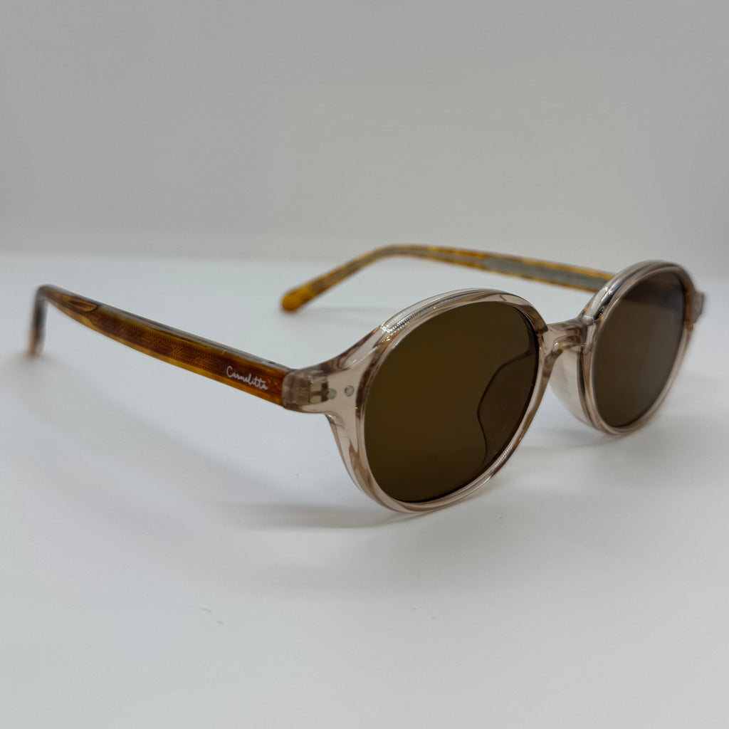 Óculos com hastes em acetato tartaruga , frente em acetato rose translúcido com lente marrom.