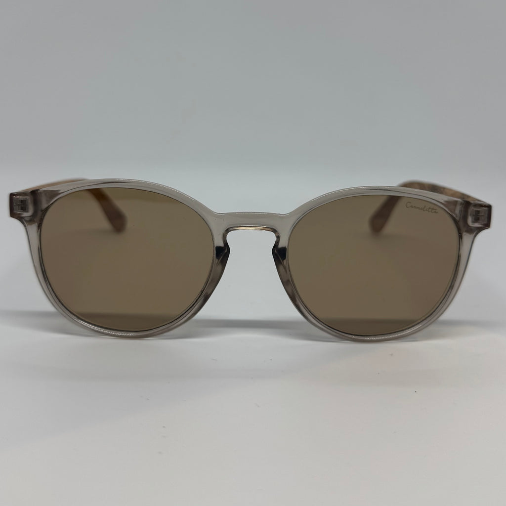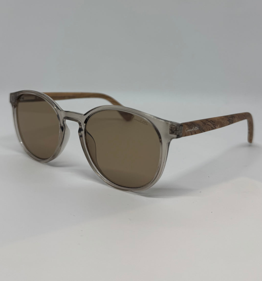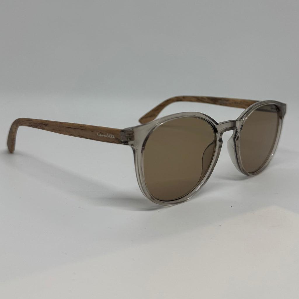 Óculos com hastes em bambu com frete em acetato marrom translúcido e lente marrom.