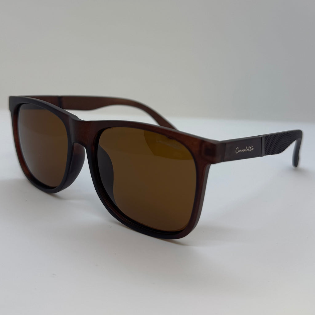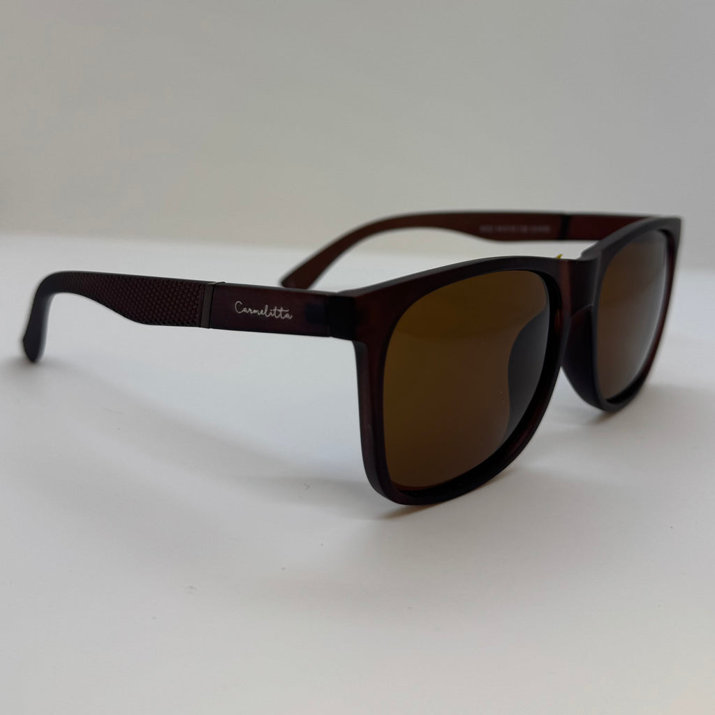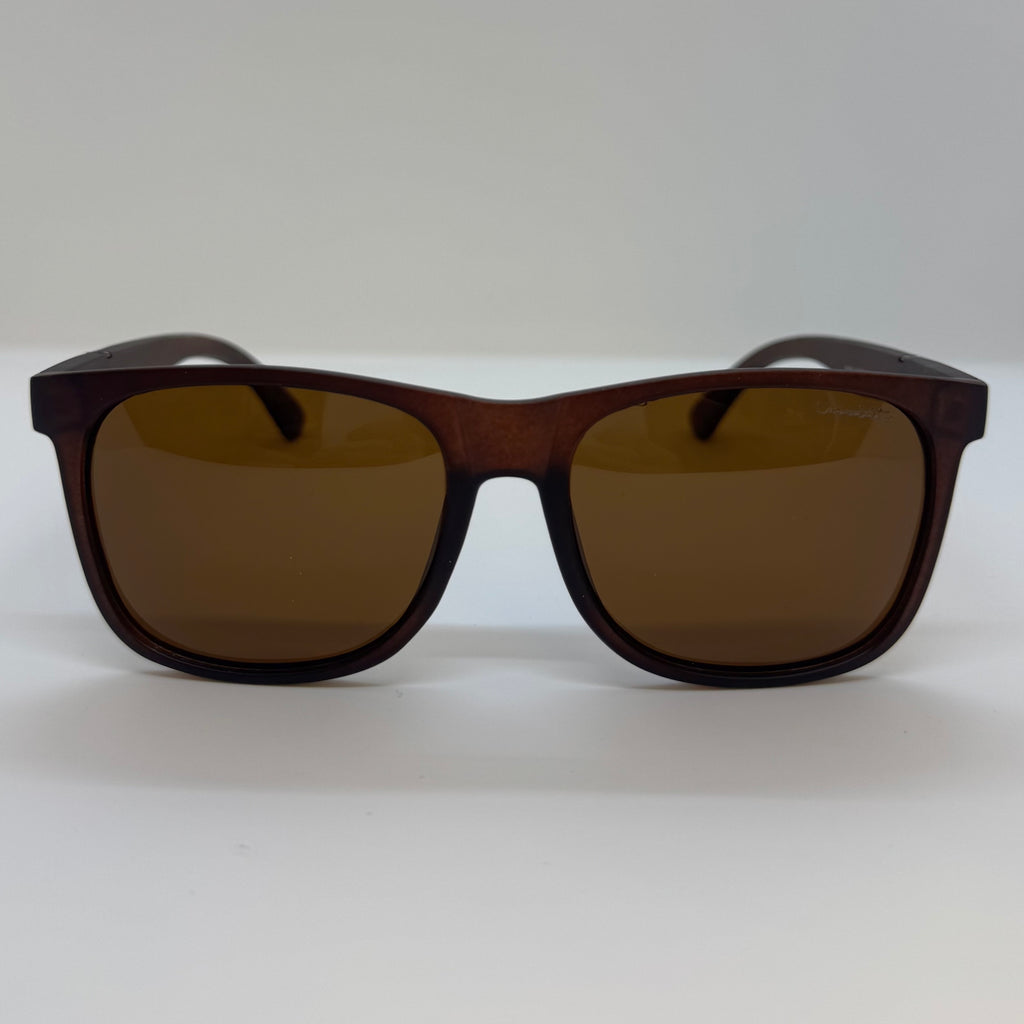 Óculos com hastes em acetato marrom e lente marrom polarizada.