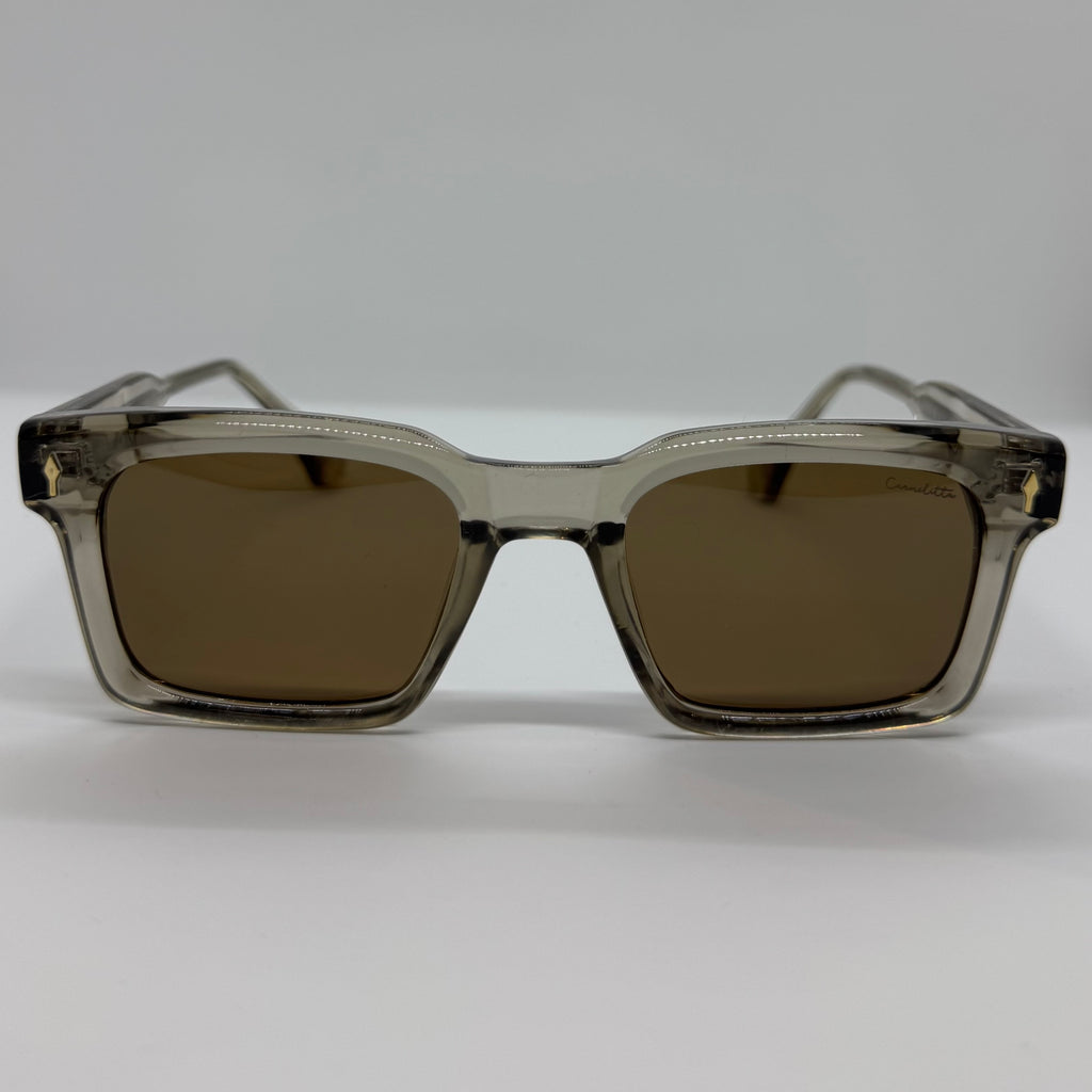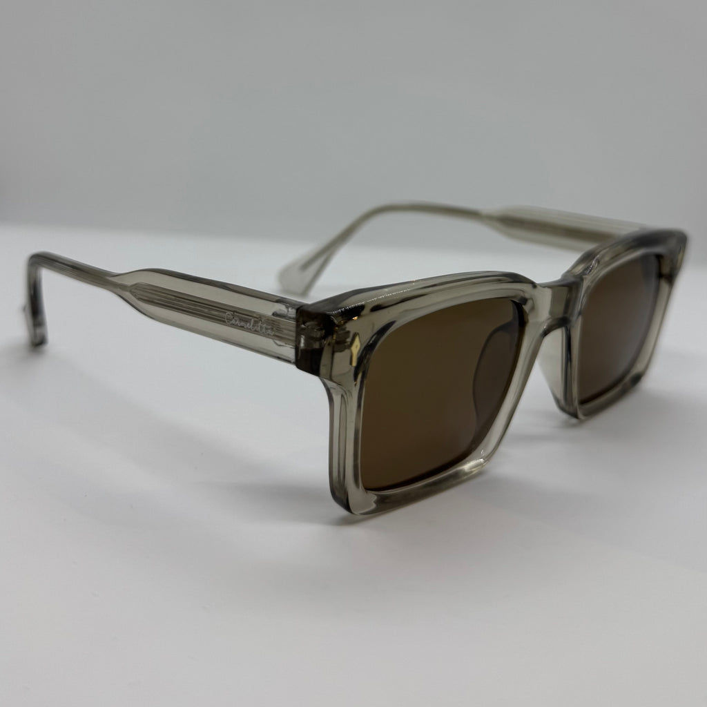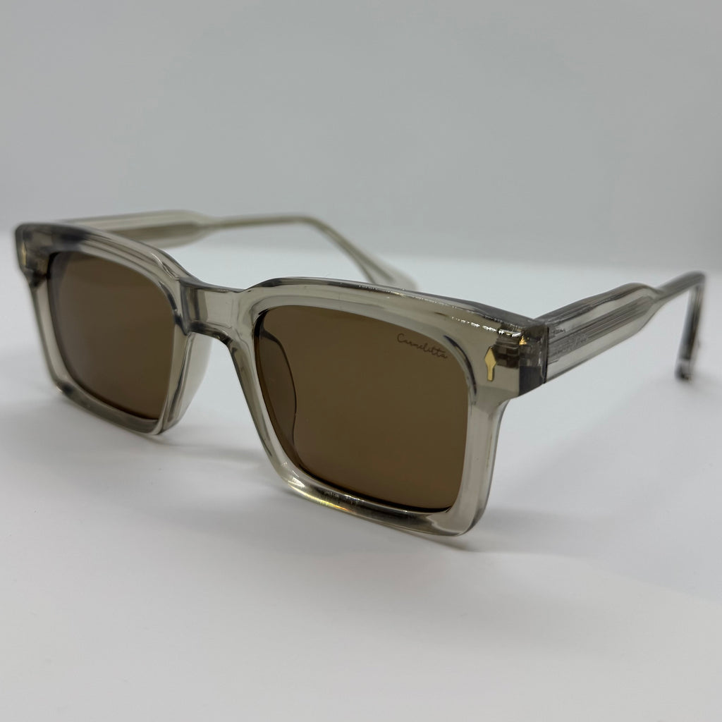 Óculos com armação em acetato de alta qualidade e resistente tendo uma cor amarronzada translucida, hastes firmes em marrom translucido, lentes em marrom, possui formato quadrado estruturado.