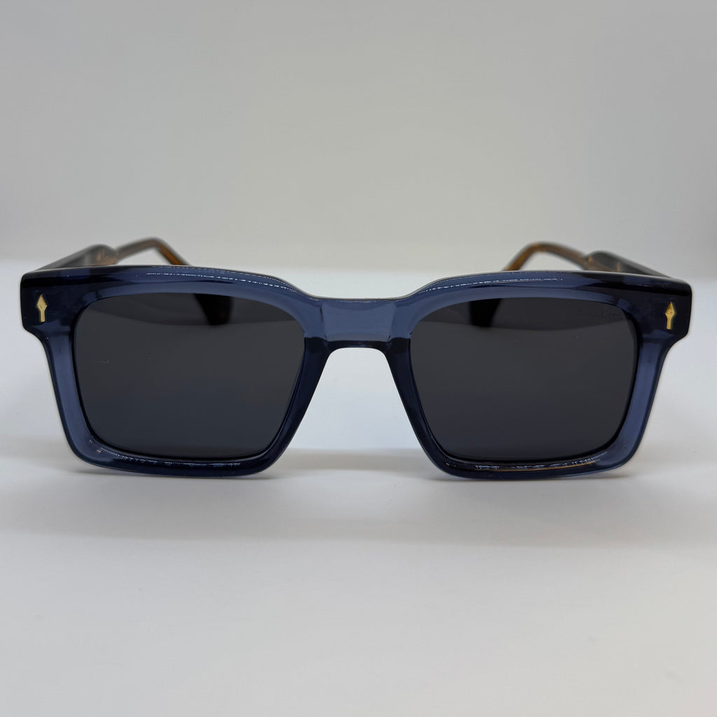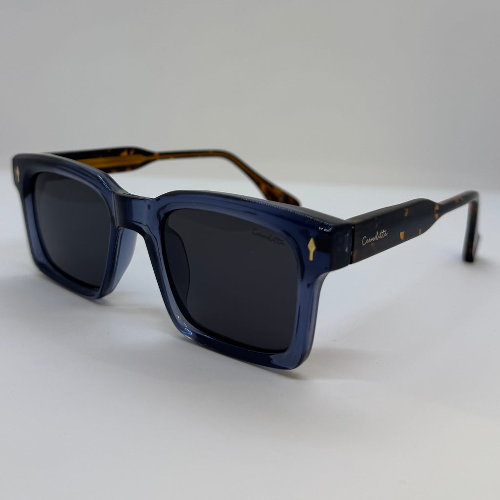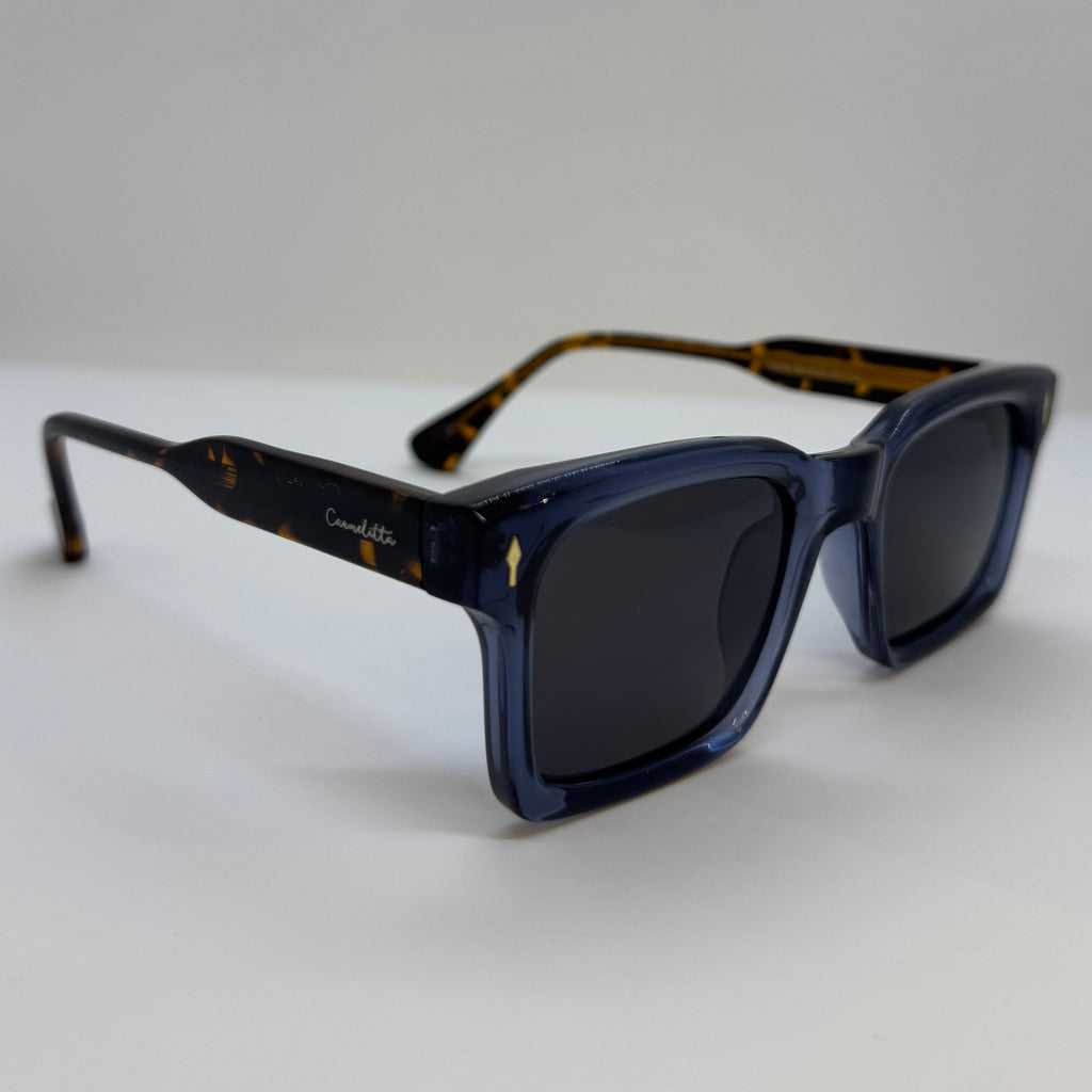 Óculos com acetato de alta densidade e resistente na cor azul marinho translucido na parte frontal, hastes em tartaruga marrom e dourado, design de formato quadrado, possui detalhes metalicos dourados nas laterais, e lentes preta.