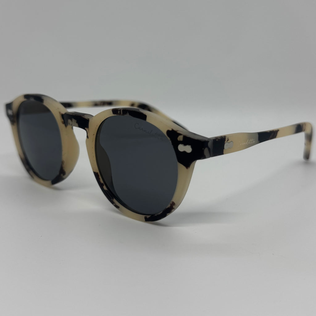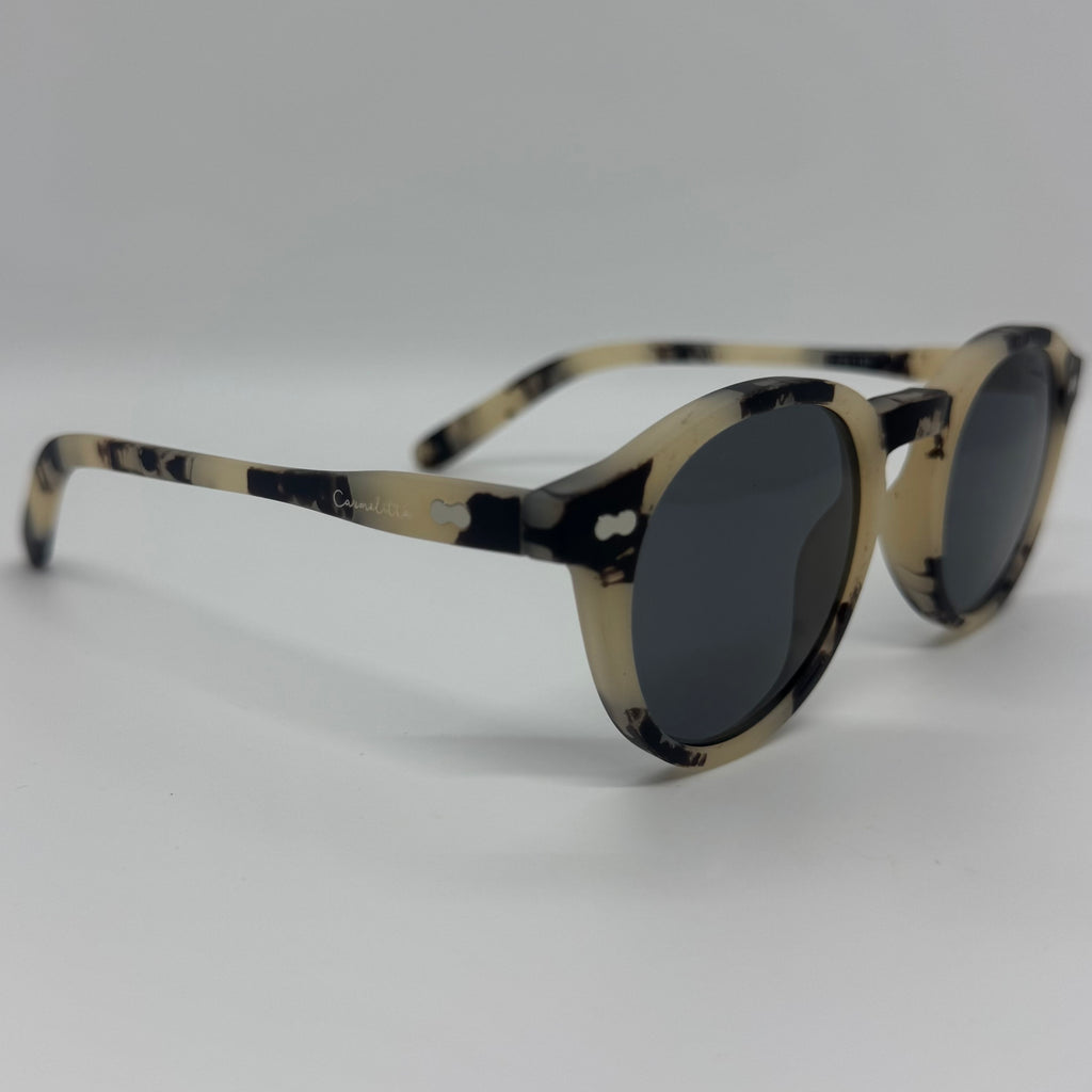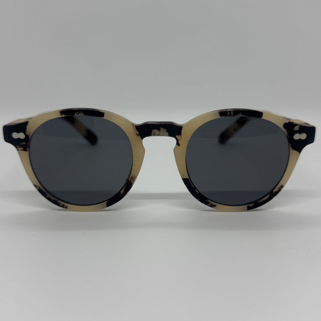 Óculos com hastes em acetato off white mesclado com preto e lente preta.