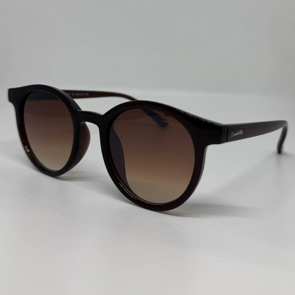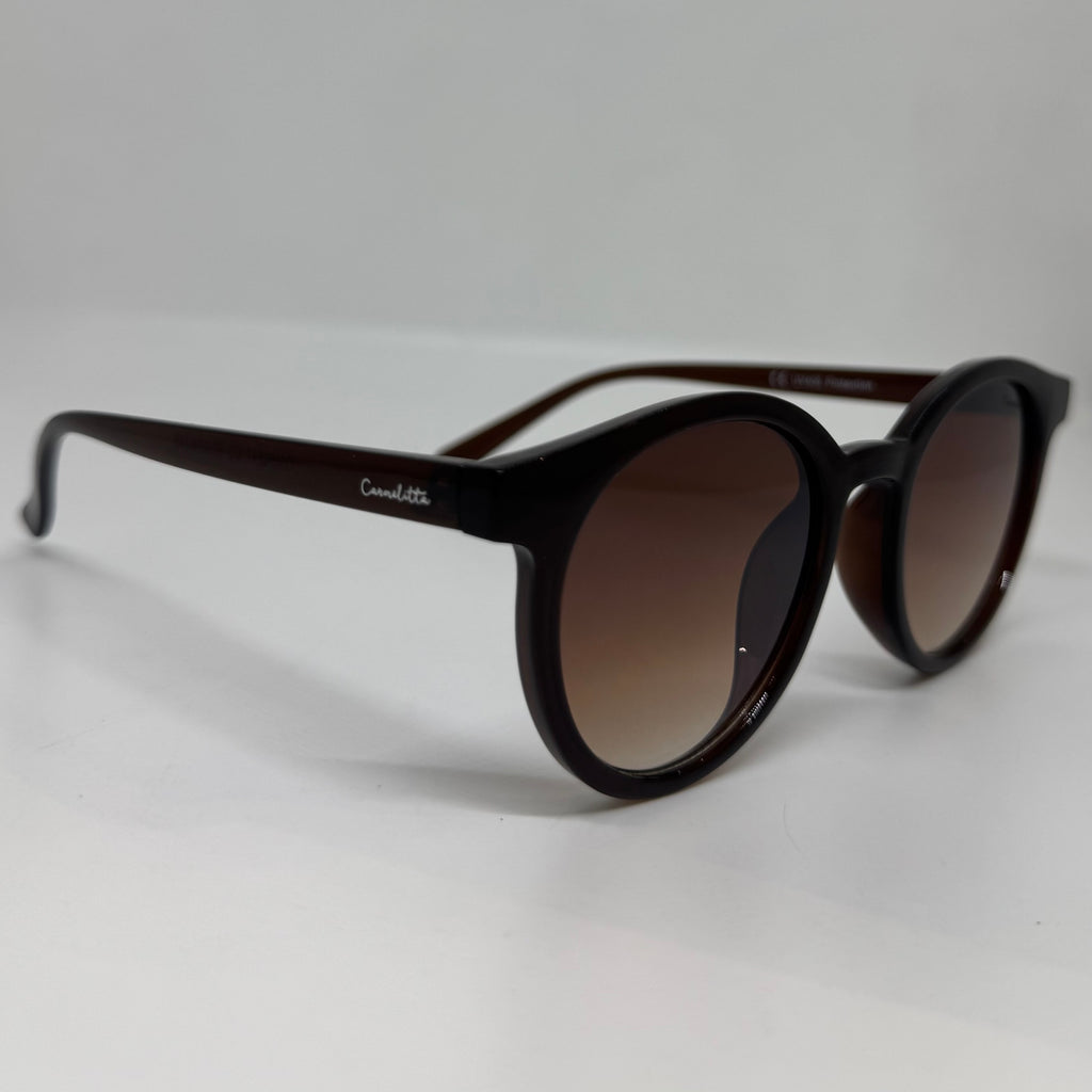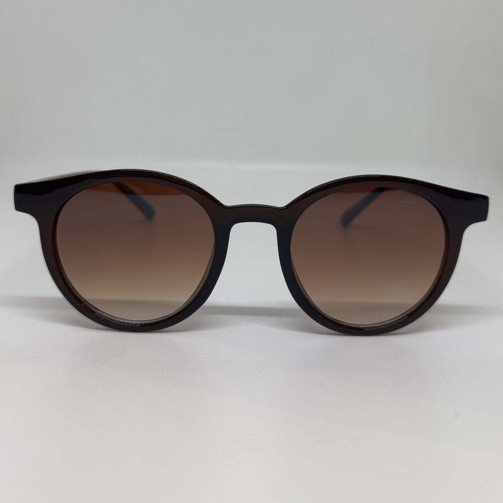 Óculos com hastes em acetato marrom com lente marrom degrade.