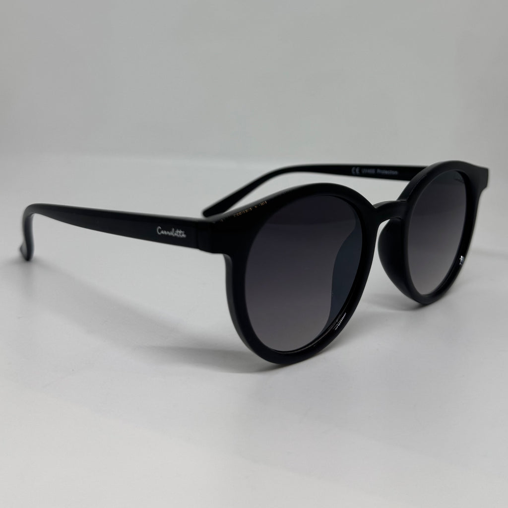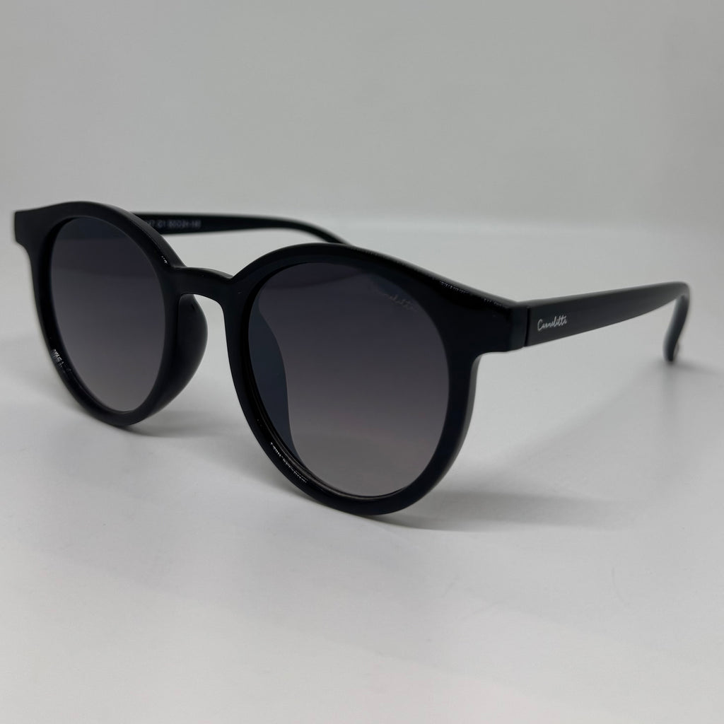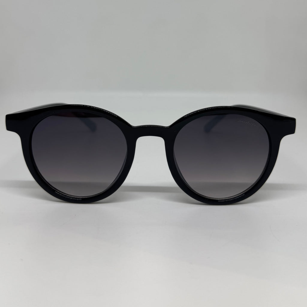 Óculos com hastes sem acetato preto com lente roxa degrade.