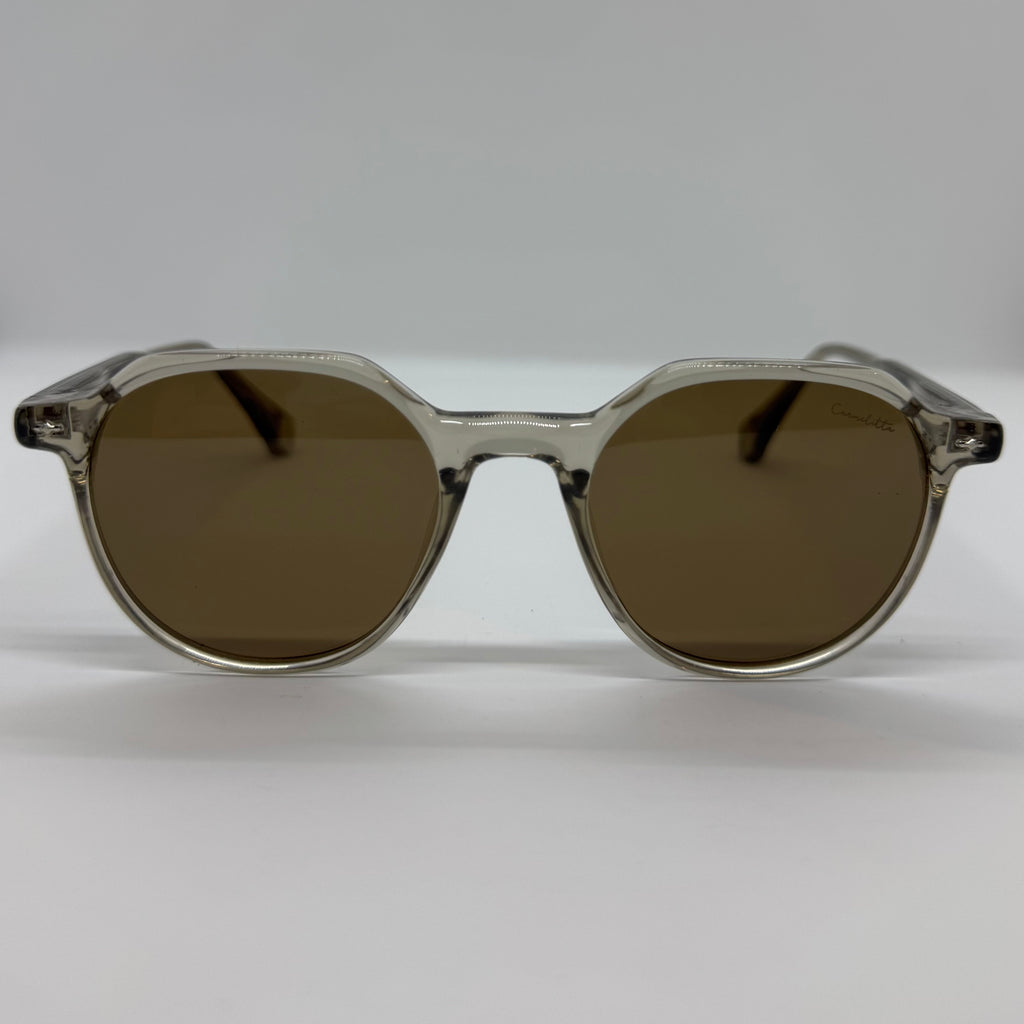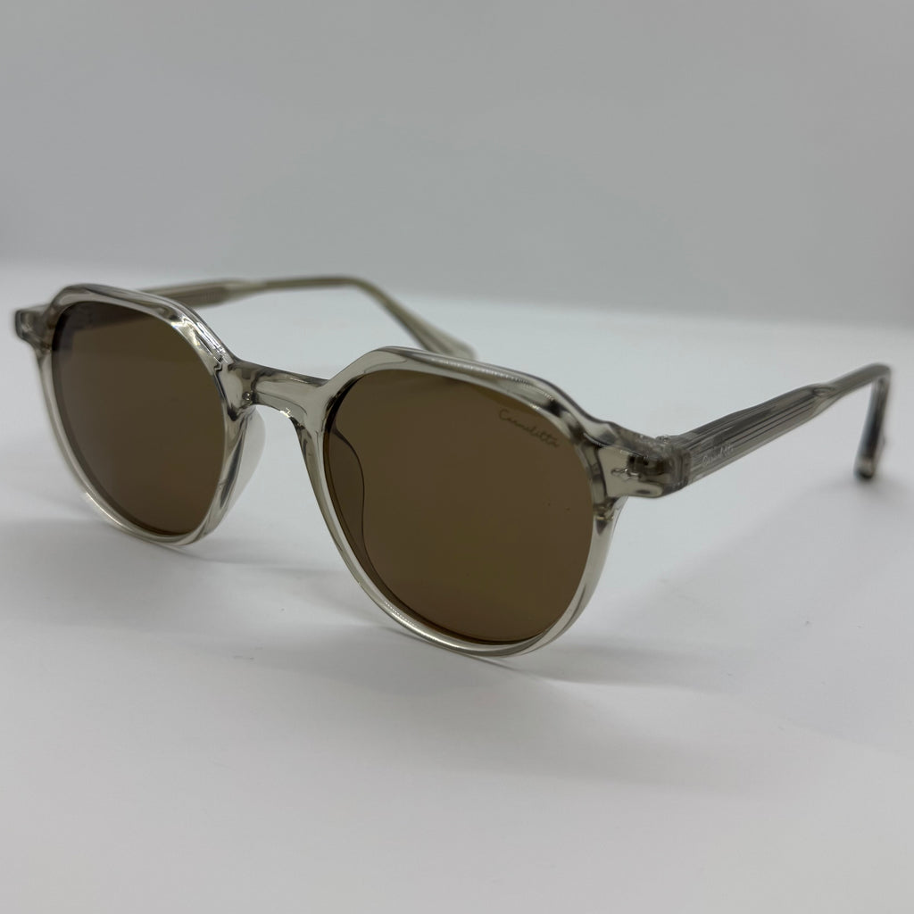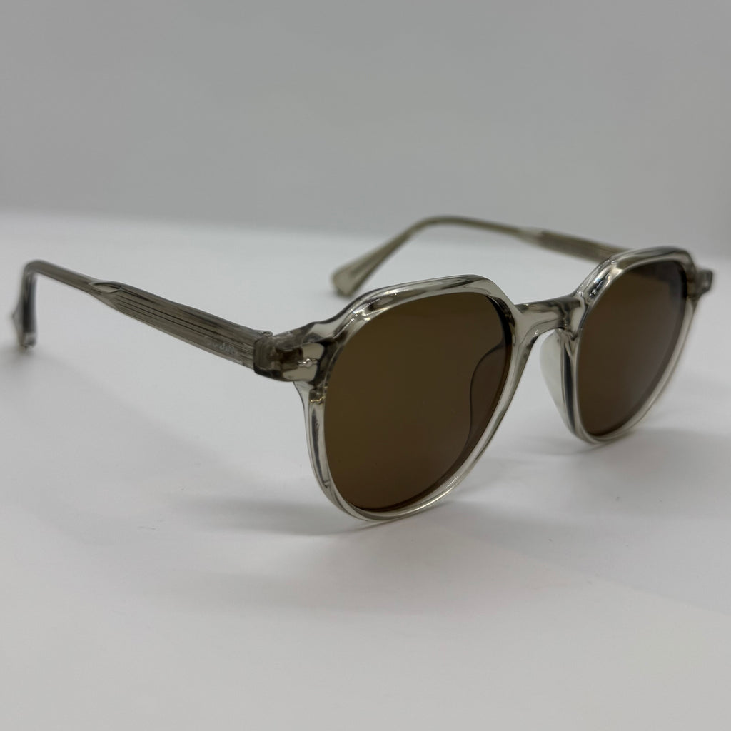 Óculos com hastes em acetato Nude translúcido com lente marrom.