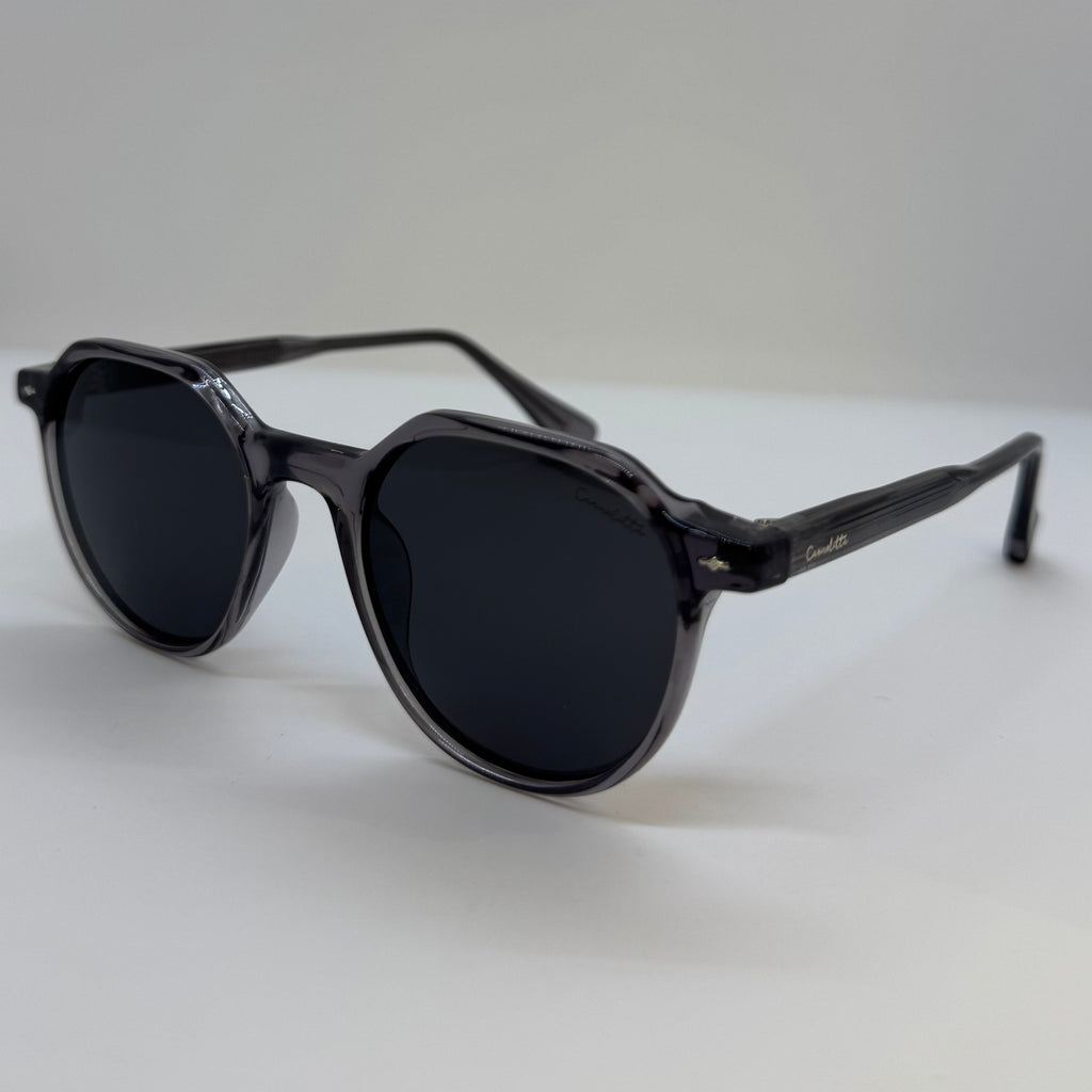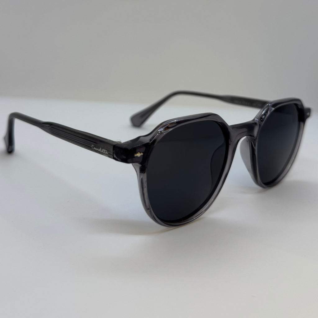 Óculos em acetato de alta durabilidade na cor preto translúcido, design de formato redondo, hastes em preto translúcido, detalhe metalico prateado na parte da frente da armação, e possui lentes preta.
