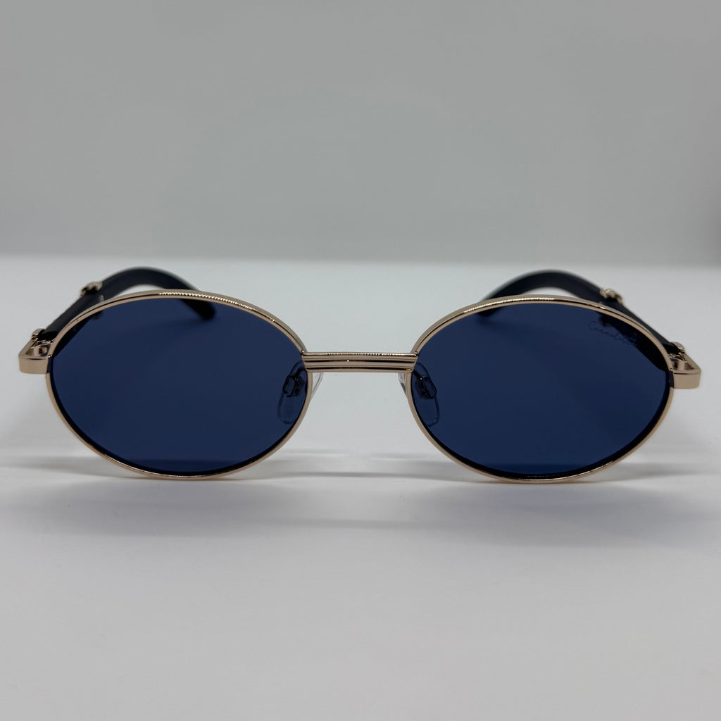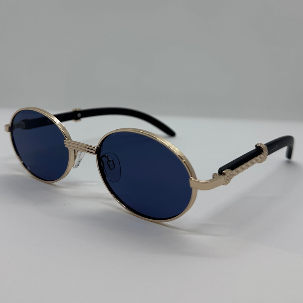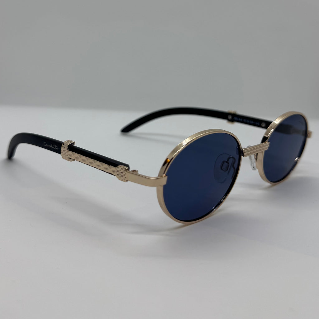 Óculos com armação em metal dourado leve e de alta durabilidade, hastes finas com detalhe texturizado e finalização em acetato preto, as lentes possuem tonalidade preta, o design apresenta um estilo redondo vintage em metal dourado.