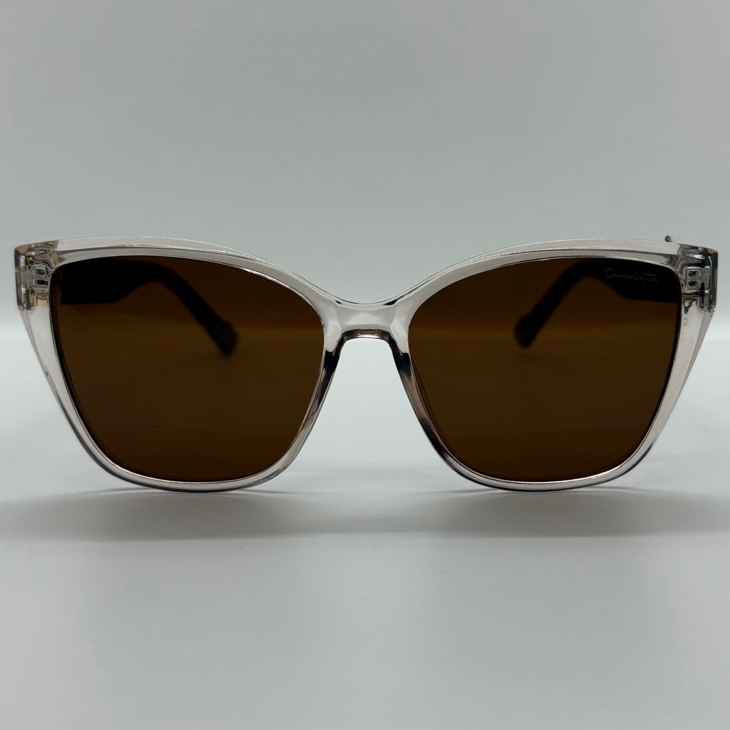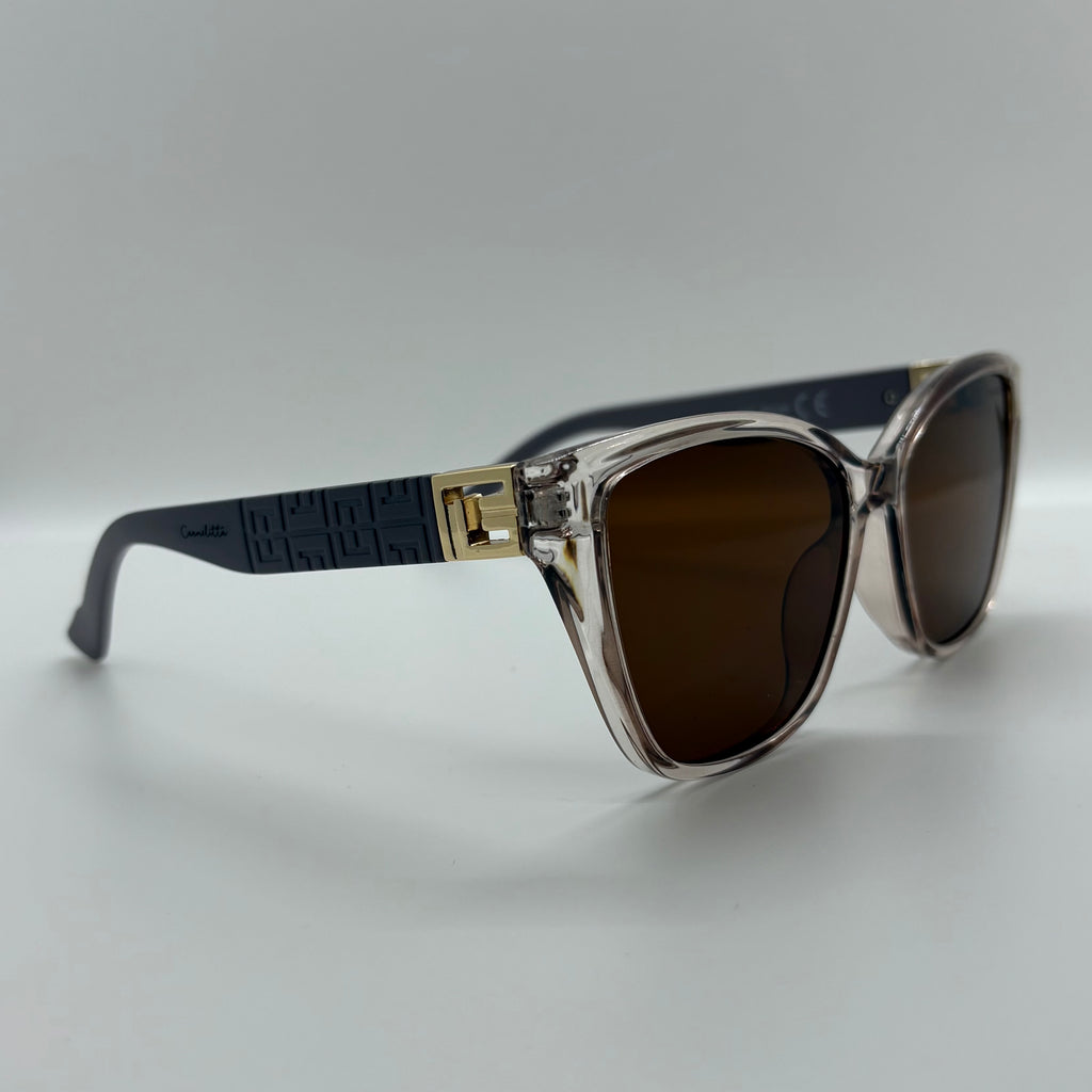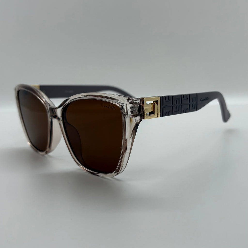 óculos com armação nude acinzentado translúcido e hastes preto fosco com detalhe dourado e textura geométrica em acetato, lentes em marrom escuro.