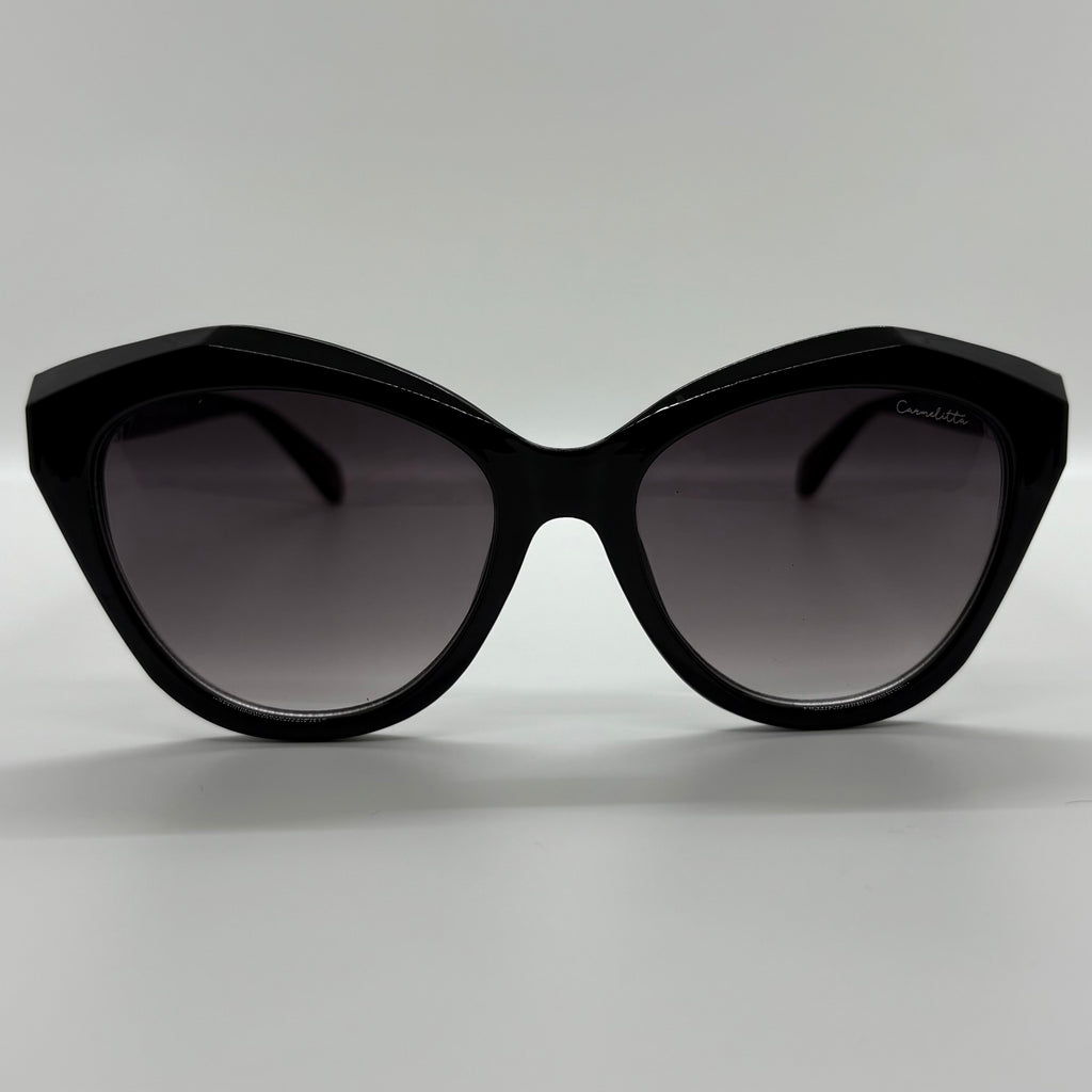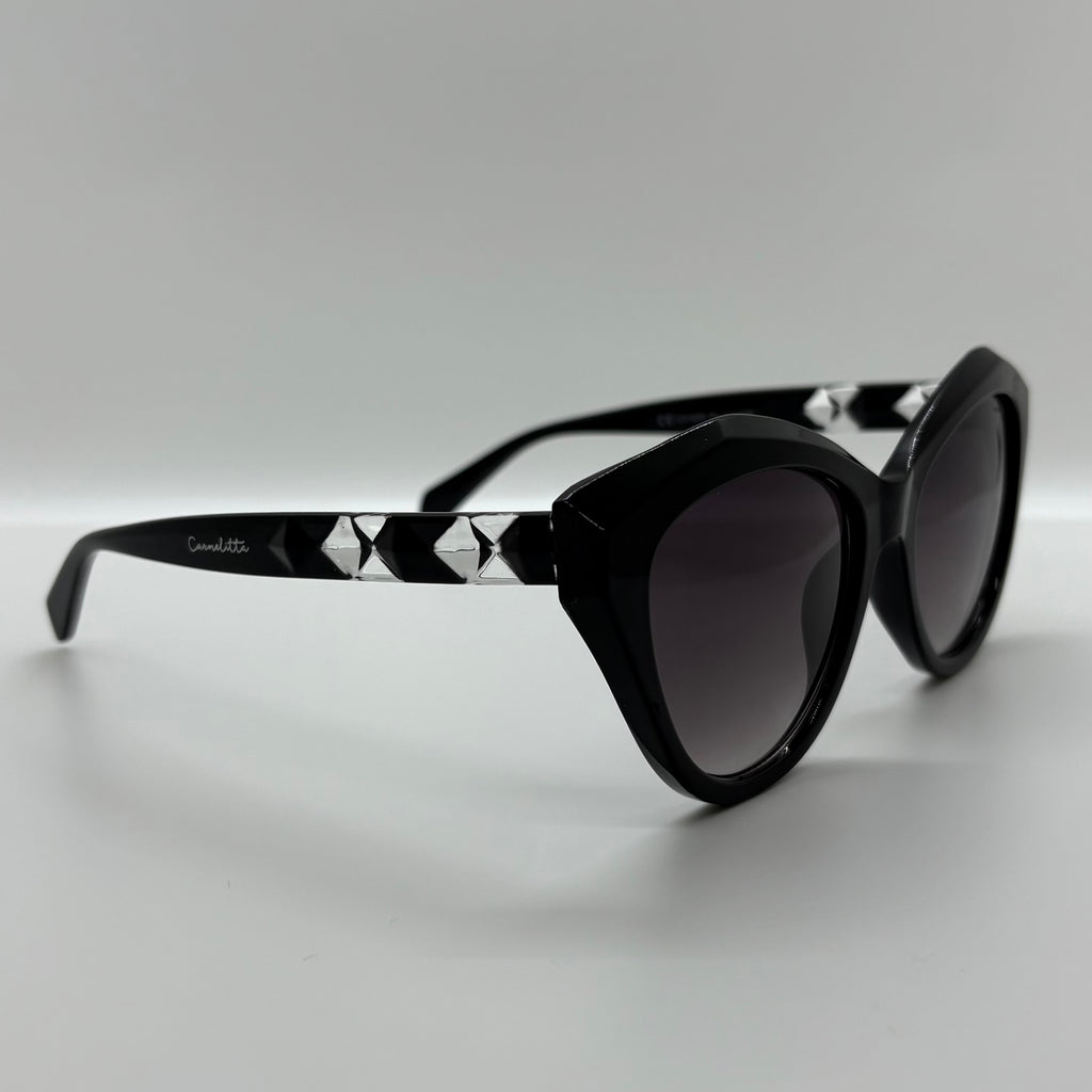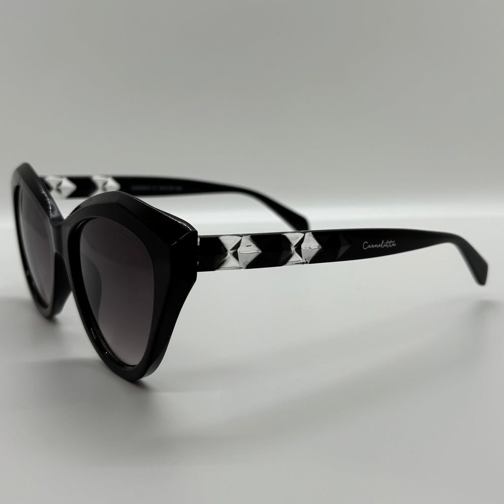 óculos com armação preta em acetato, com hastes em detalhes preto e cristal geométricos translúcidos e lente em preto degradê.