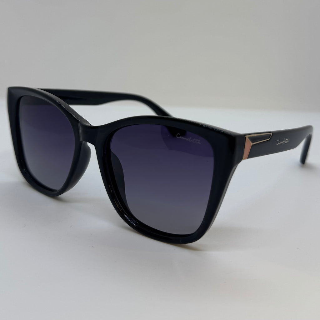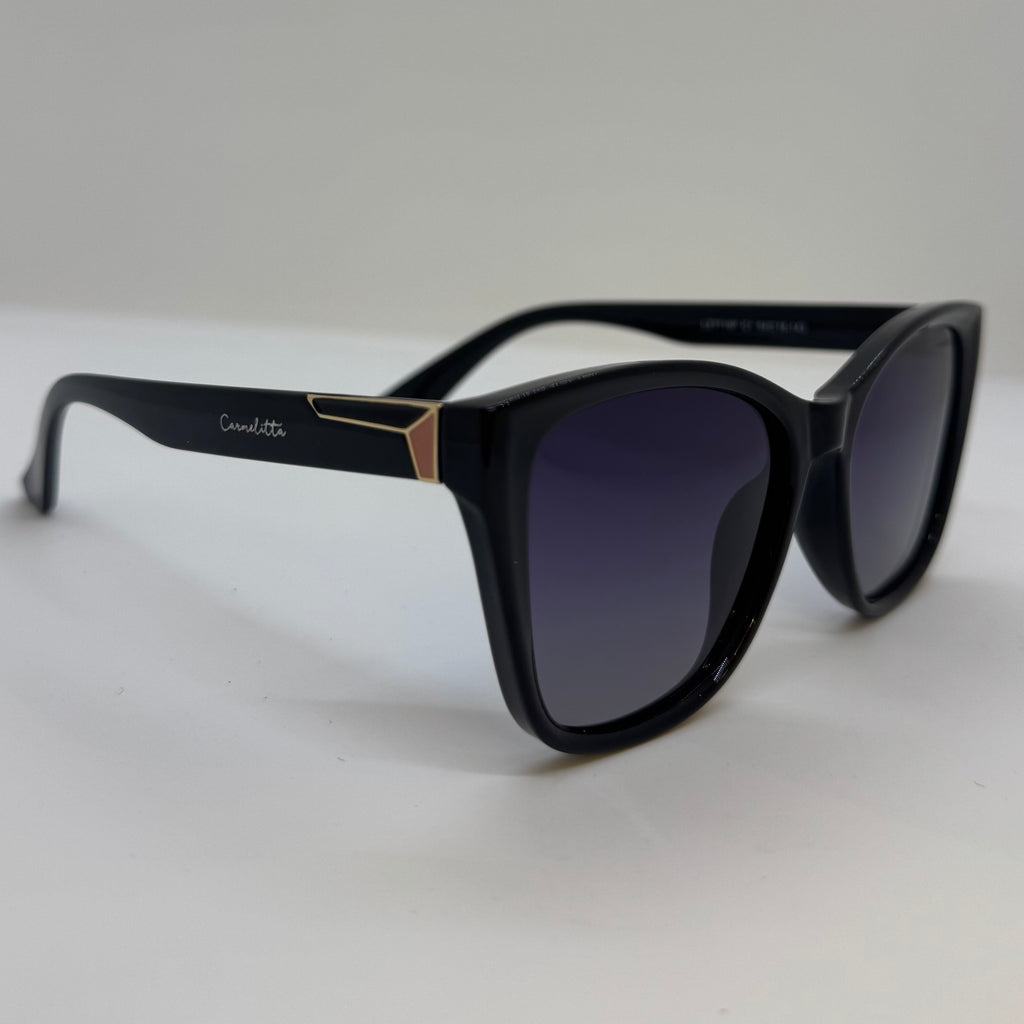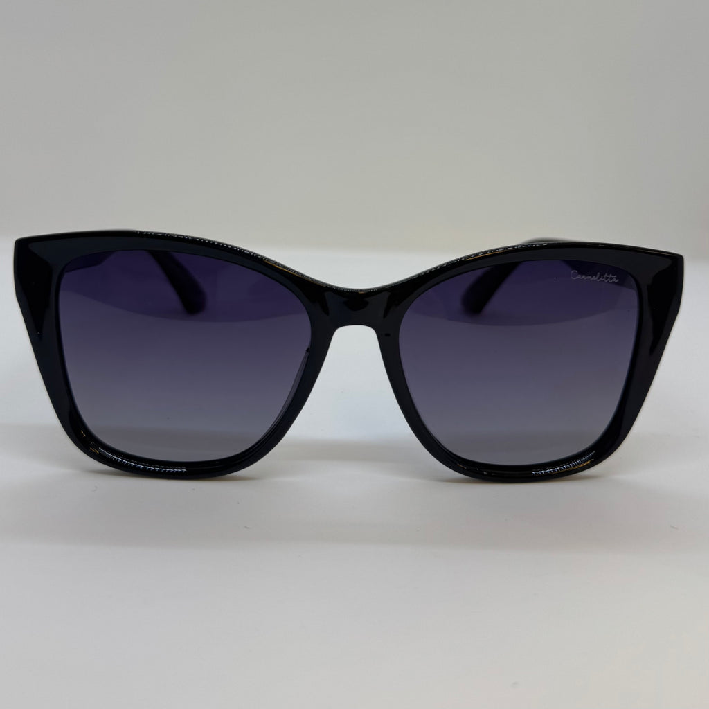 Óculos com armação em acetato de alta resistência na cor preto, hastes com encaixe confortável em preto e detalhes metalicos na dobradiça, as lentes em fumê que garantem maior estabilidade visual, além de possuir um formato quadrado levemente gatinho que traz um ar de sofisticação e elegância.
