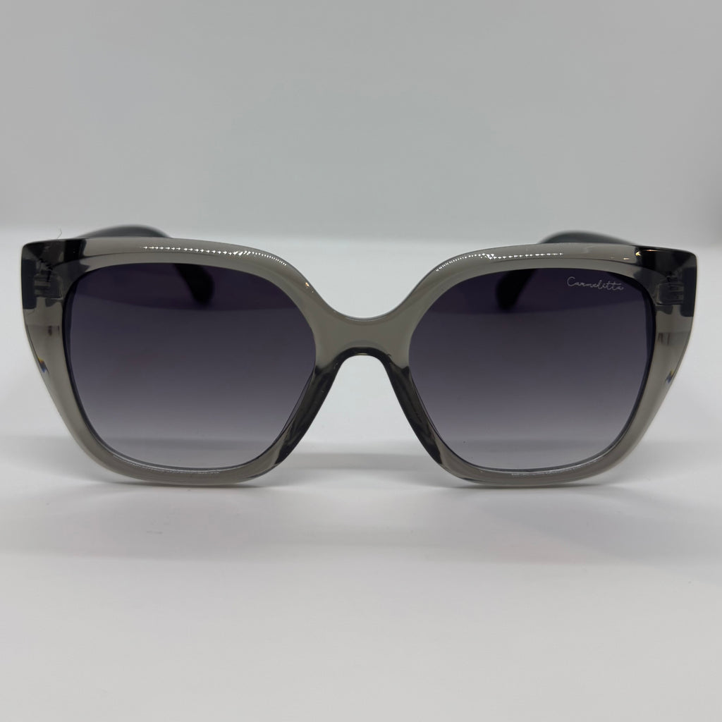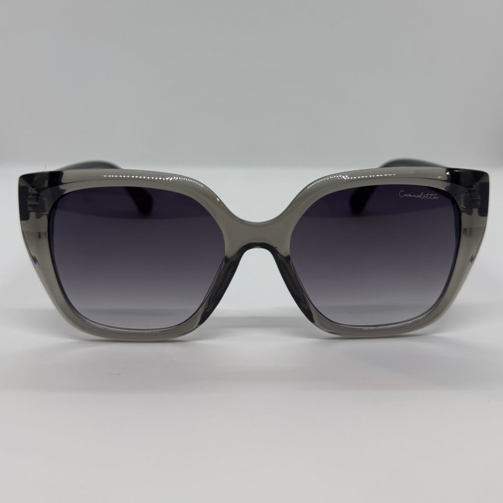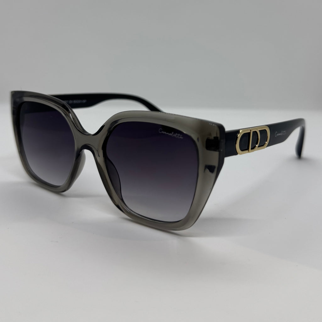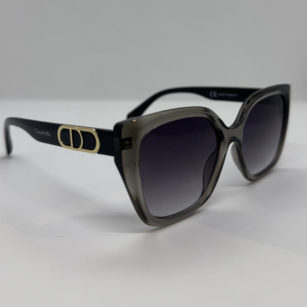 Óculos com hastes cinza translúcido com detalhes dourado e lente roxa degrade.