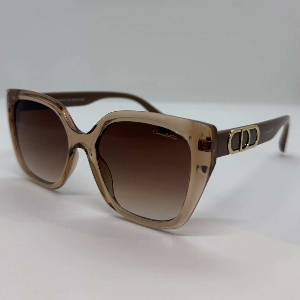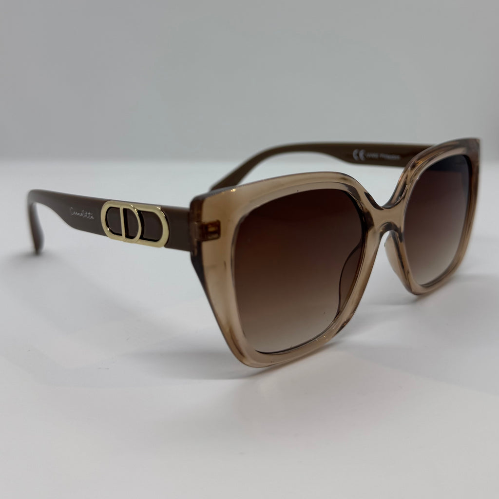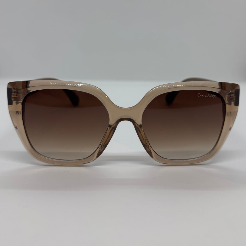 Óculos com hastes em acetato Nude com frente na cor rose translúcido e lente marrom degrade.