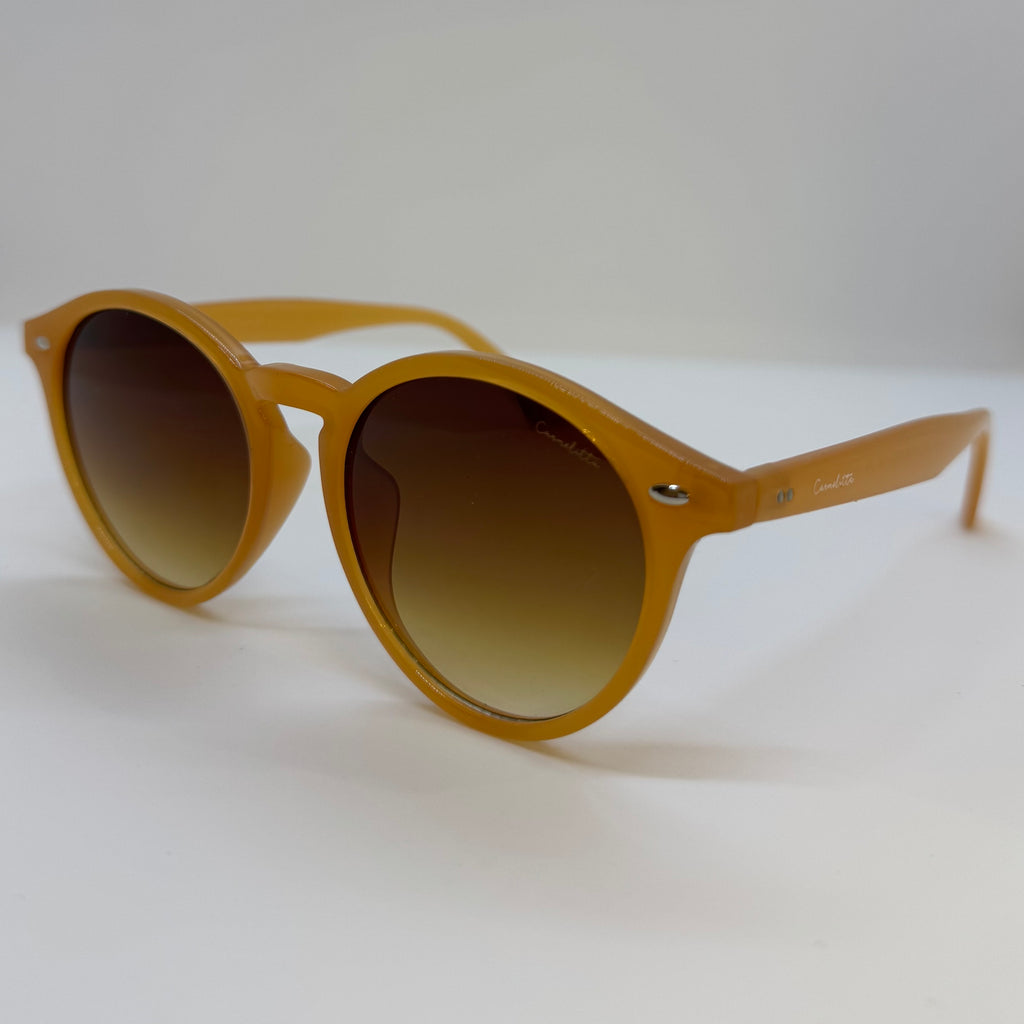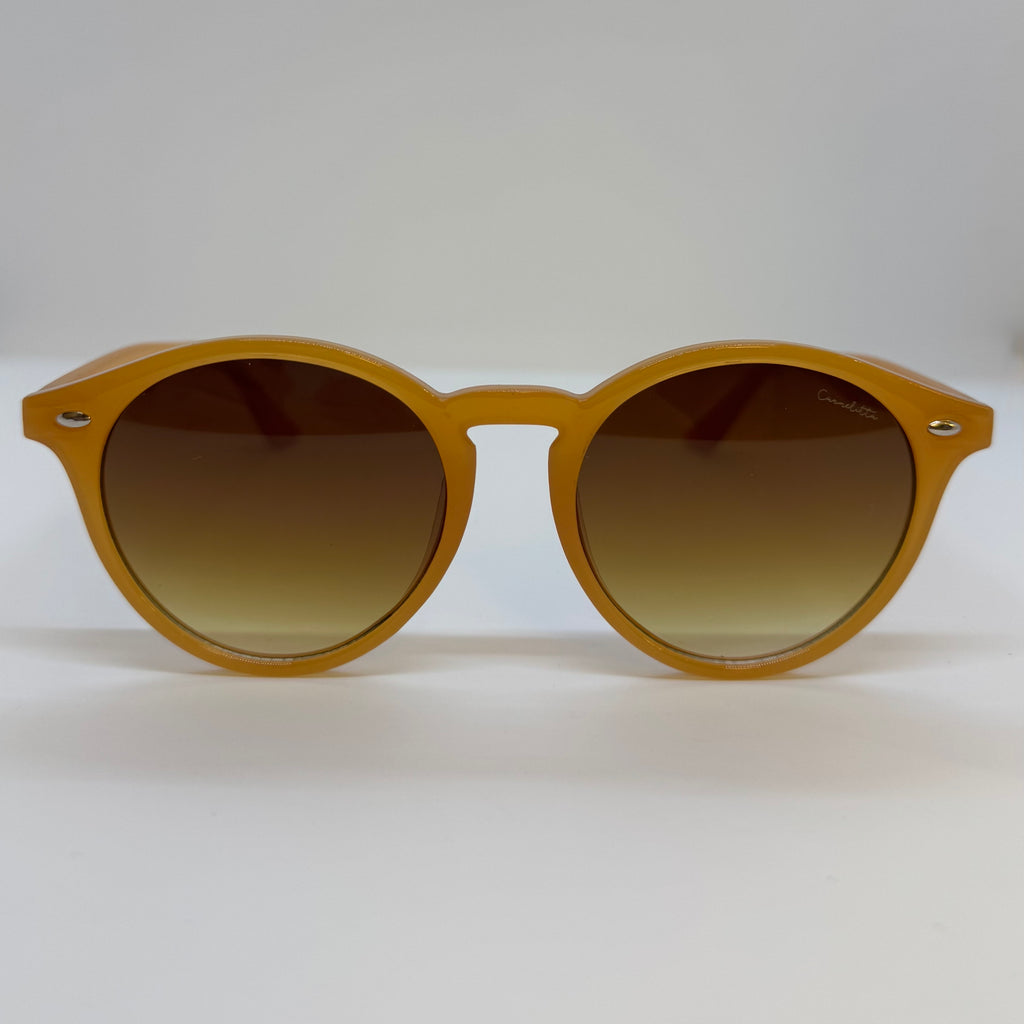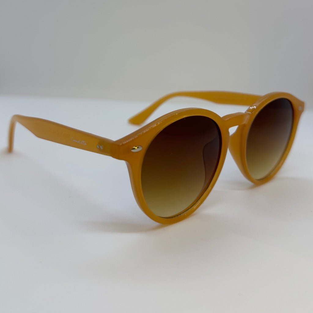 Óculos em acetato leve e resistente com frente e hastes possuindo cor amarelo mostarda, design redondo, pequenos detalhes prateados nas laterais, e lentes marrom degradê.
