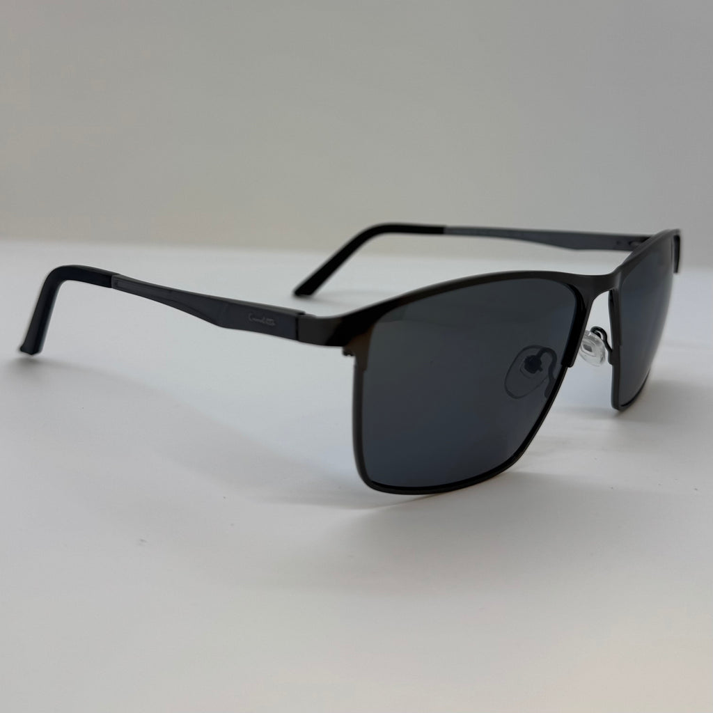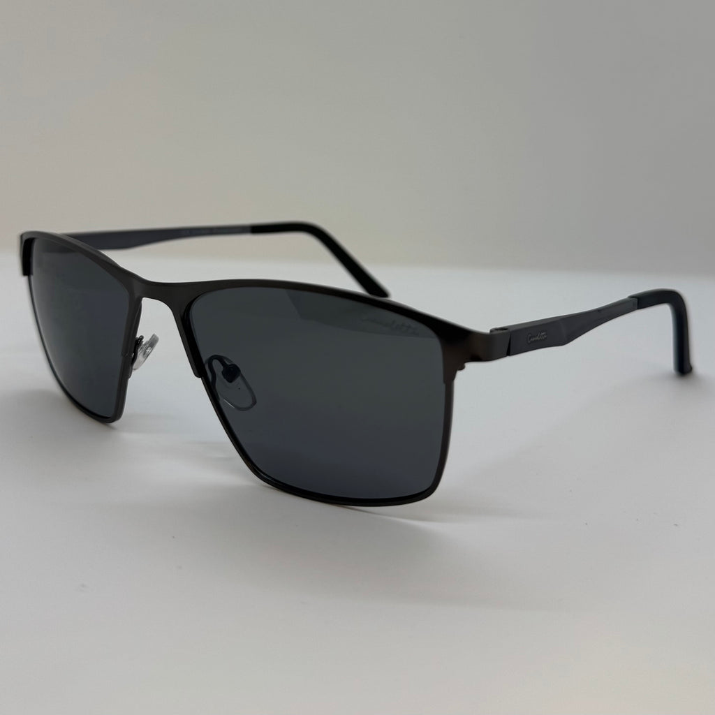 Óculos com hastes em metal grafite com lente preta polarizada.